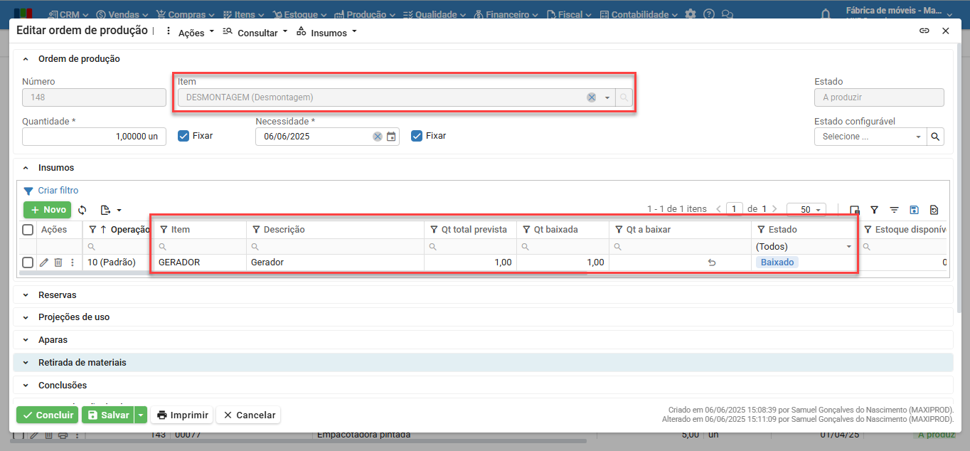 a) No exemplo abaixo, foi criada a OP de desmontagem de um gerador. Ou seja, nossa empresa comprou um gerador para aproveitar as peças. Portanto, como é uma desmontagem completa, o item produto da OP é chamado de “Desmontagem”, e o insumo a ser baixado será o próprio gerador.
