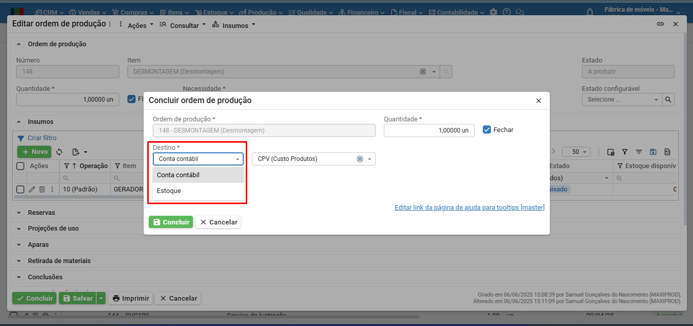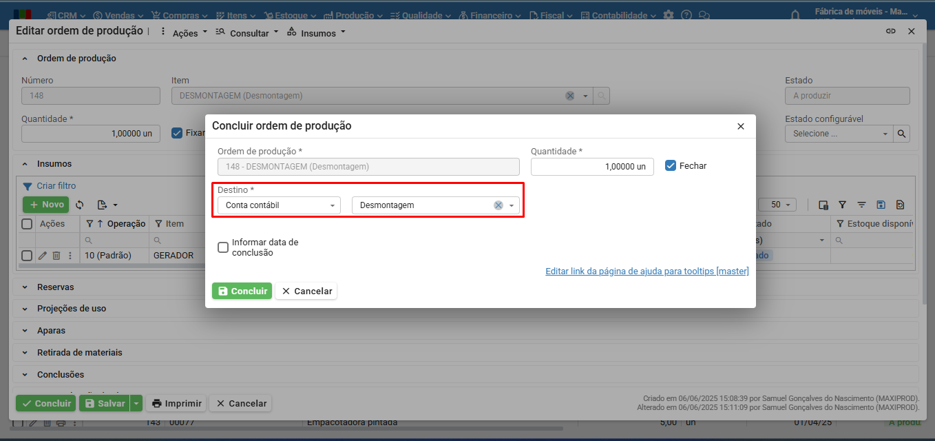 5) Nos casos de desmontagem completa, onde o item-produto da OP não será destinado ao estoque, é necessário concluir para uma “Conta contábil”. Para isso pode ser criada uma conta contábil na finalidade “Despesa” chamada “Desmontagem”, apenas para este fim. Para saber mais sobre conta contábil, clique aqui.