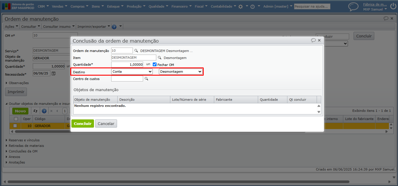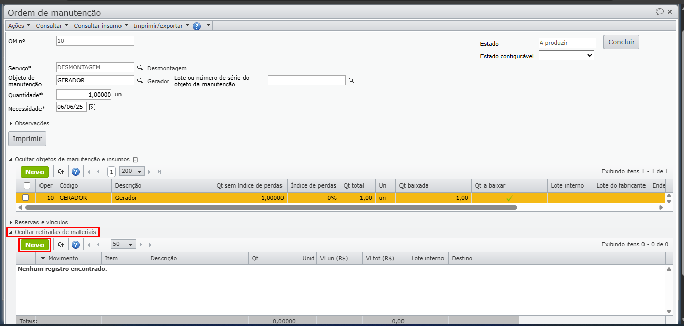 a) No exemplo abaixo, foi criada a OM de uma desmontagem de gerador. Ou seja, minha empresa comprou determinado gerador a fim de aproveitar as peças. Portanto, é cadastrado um item com procedência “Serviço/manutenção” com descrição “Desmontagem”. Para saber mais sobre cadastro de itens, clique aqui.