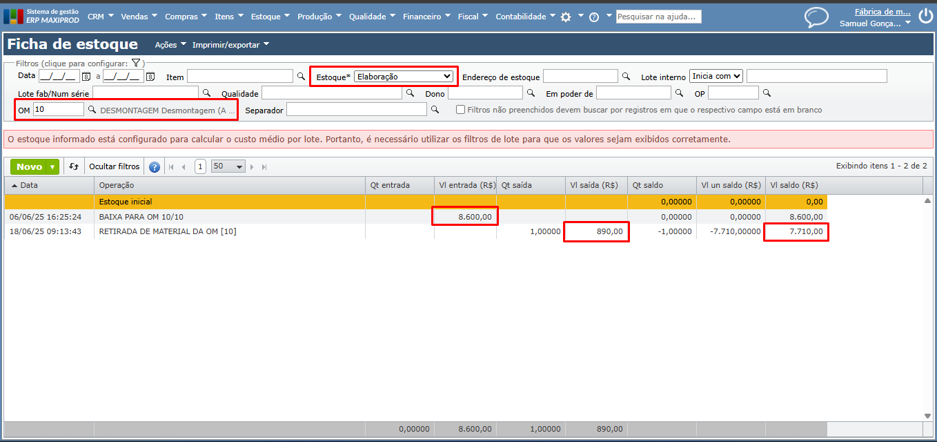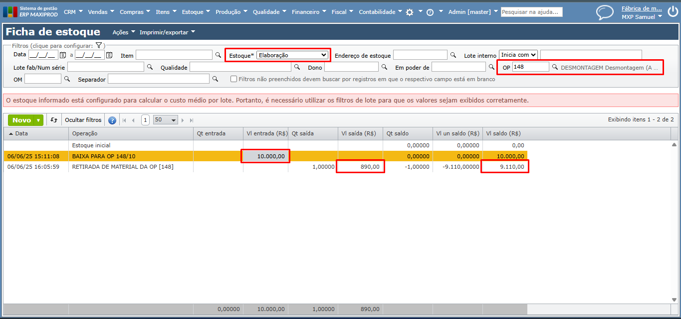 4) Ao consultar a ficha de estoque elaboração da OP, e observar as colunas referente a custo, pode-se entender melhor os reflexos da retirada de materiais.