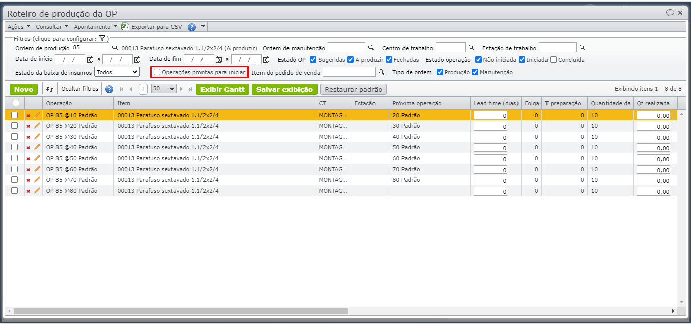 Uma operação é considerada pronta para iniciar quando todas as operações anteriores da OP estão concluídas ou iniciadas.