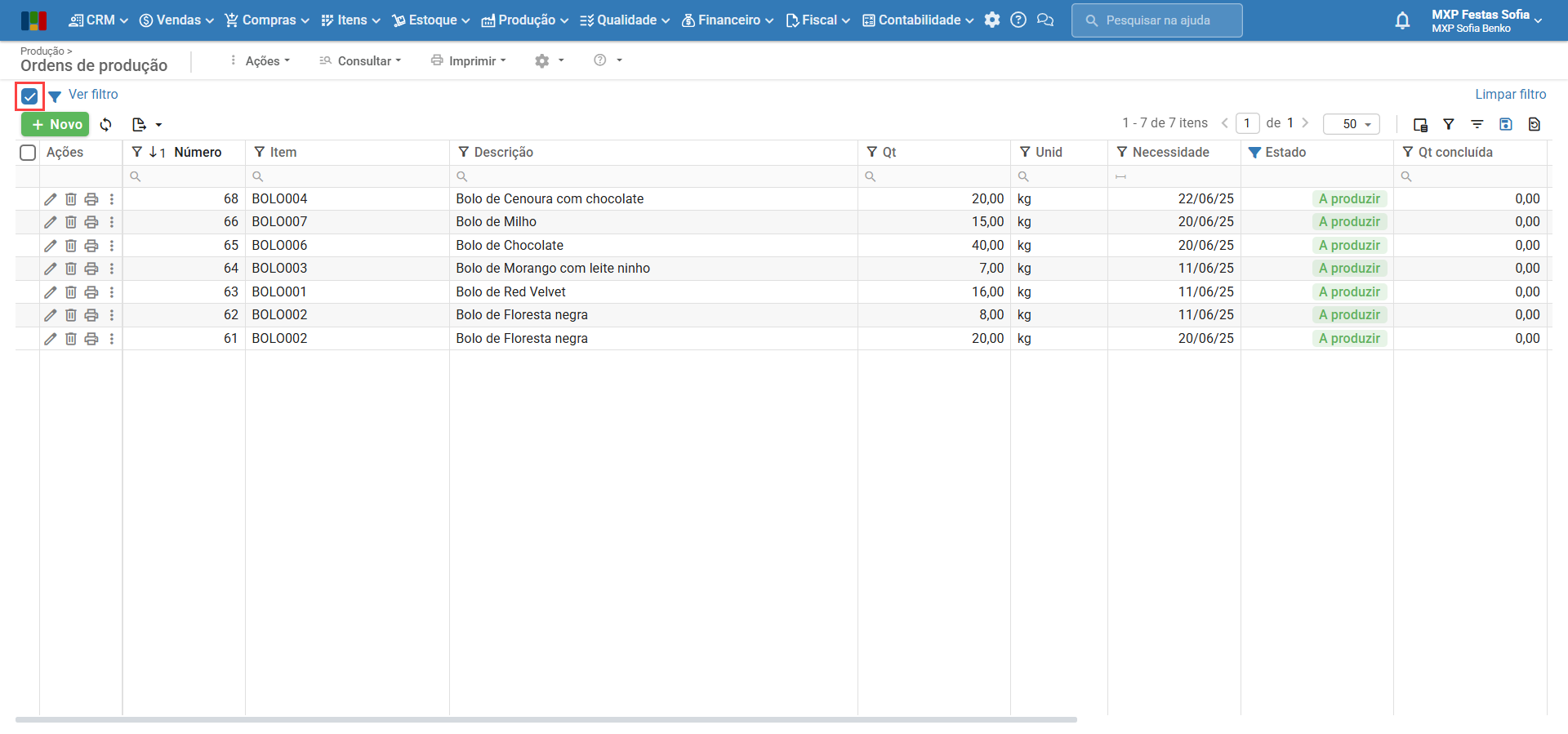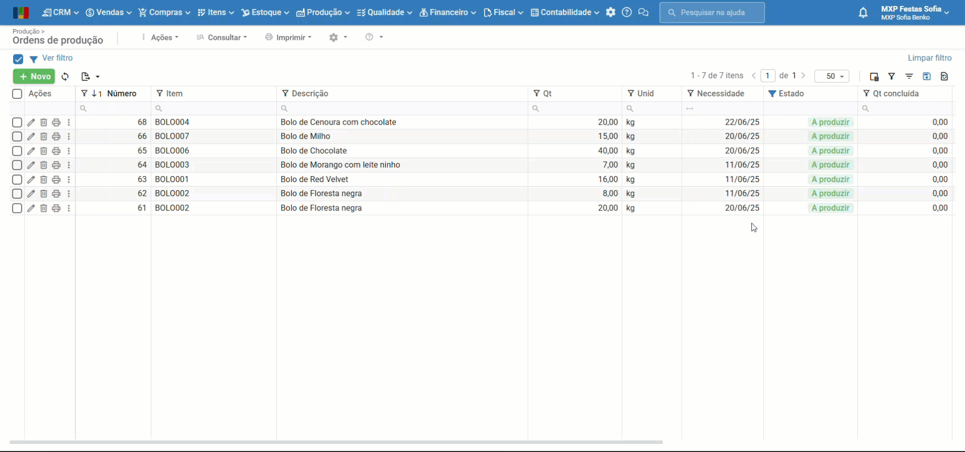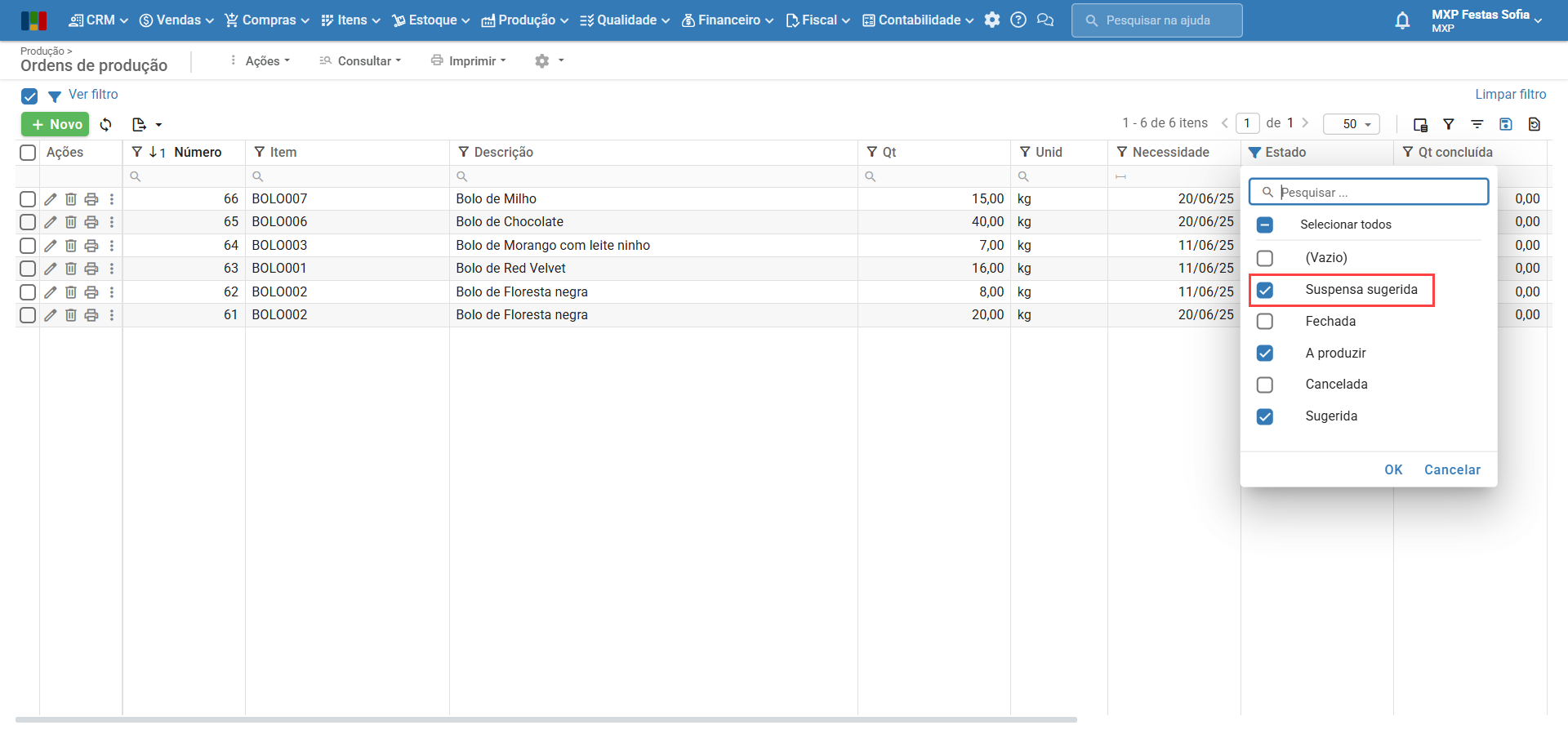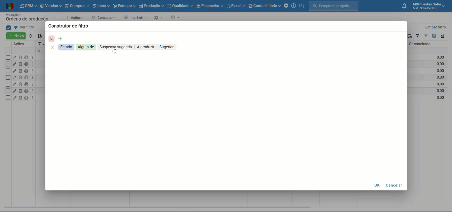 2) A nova versão de ordens de produção inicializa com um construtor, que filtra somente OPs nos estados “Suspensa sugerida”, “A produzir” e “Sugerida”. Clique nesta lista, para alterar o estado para “Cancelado”.