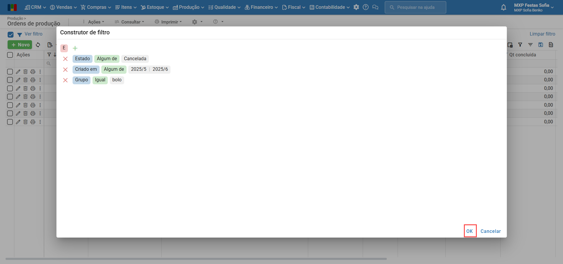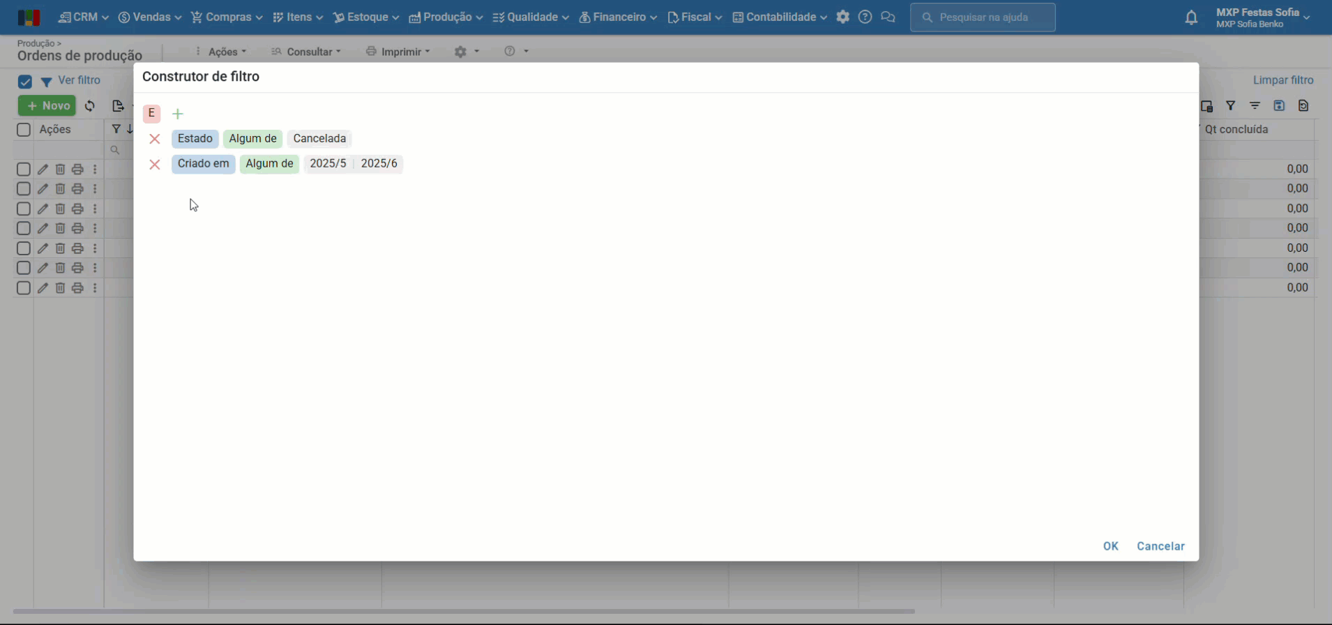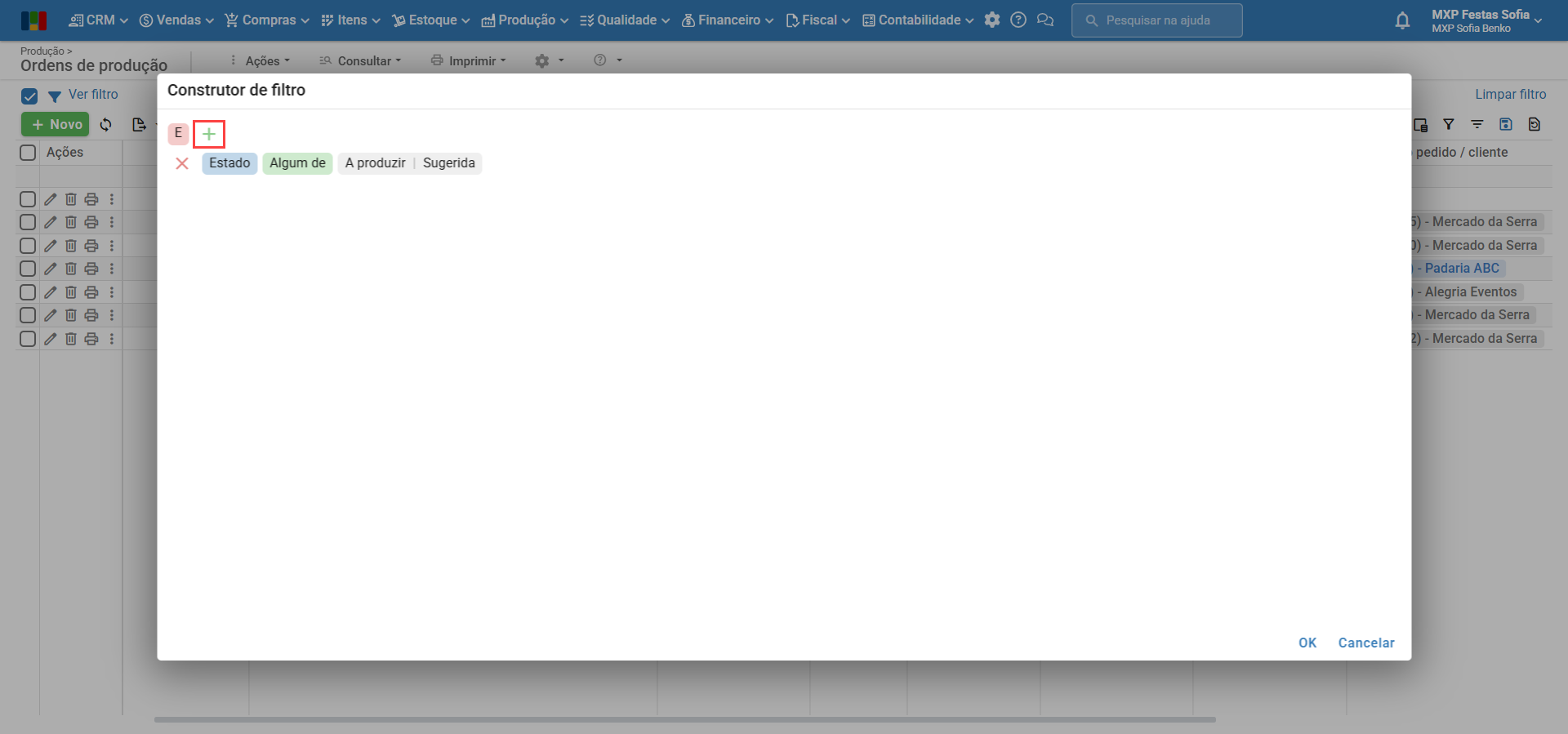 Apesar do construtor de filtro não ser uma função exclusiva da nova versão das ordens de produção, esta versão torna mais necessário entender seu uso. Ele utiliza operadores lógicos para a personalização de filtros, para simplificar seu uso.