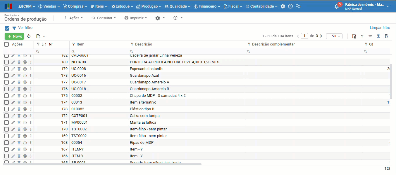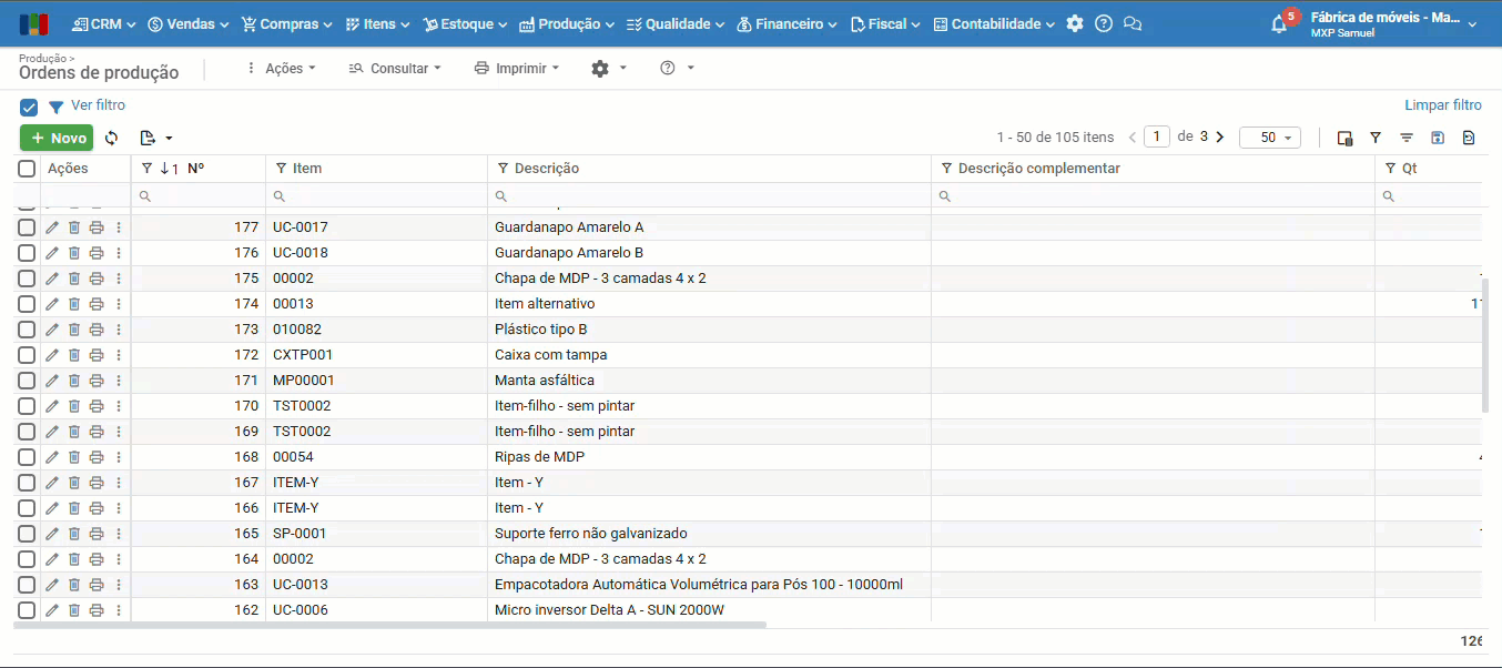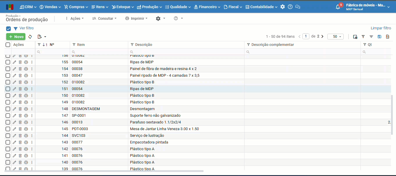 Resposta: na nova versão, os filtros de cada propriedade das OPs ficam localizados na respectiva coluna dessa propriedade. No exemplo abaixo, as ordens de produção foram filtradas a partir do filtro “Descrição”.
