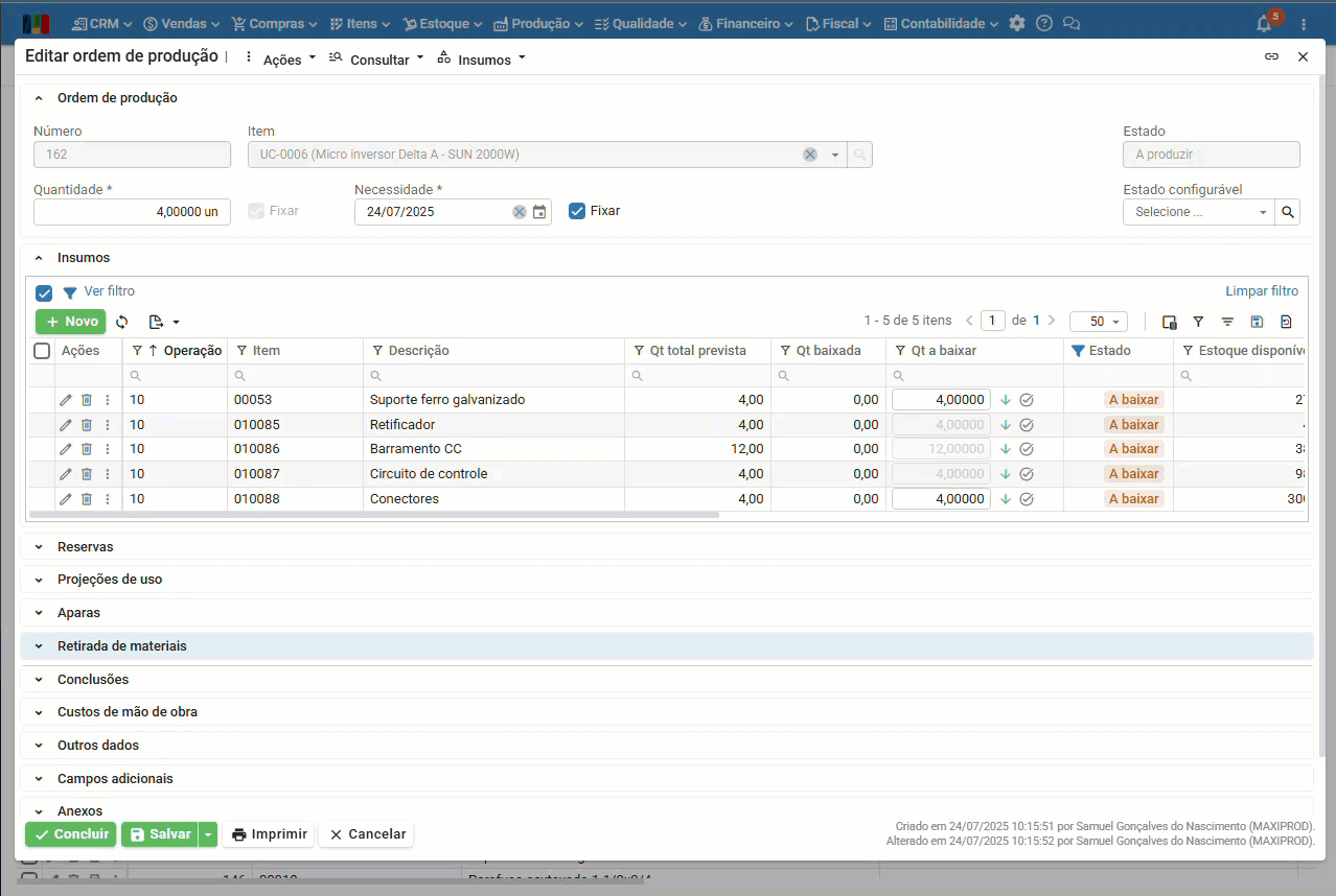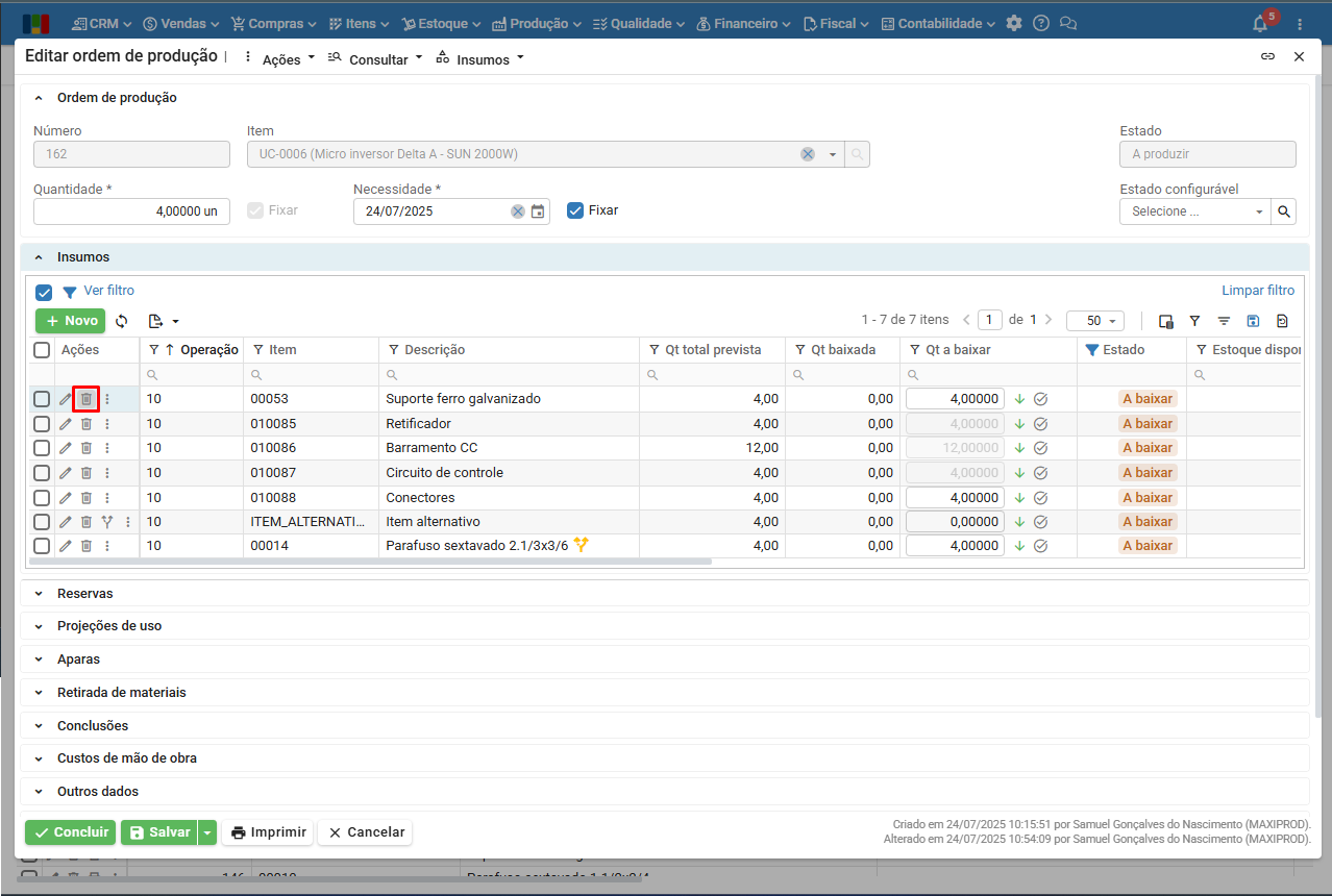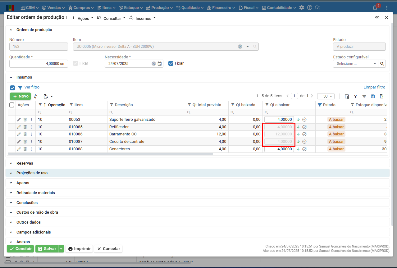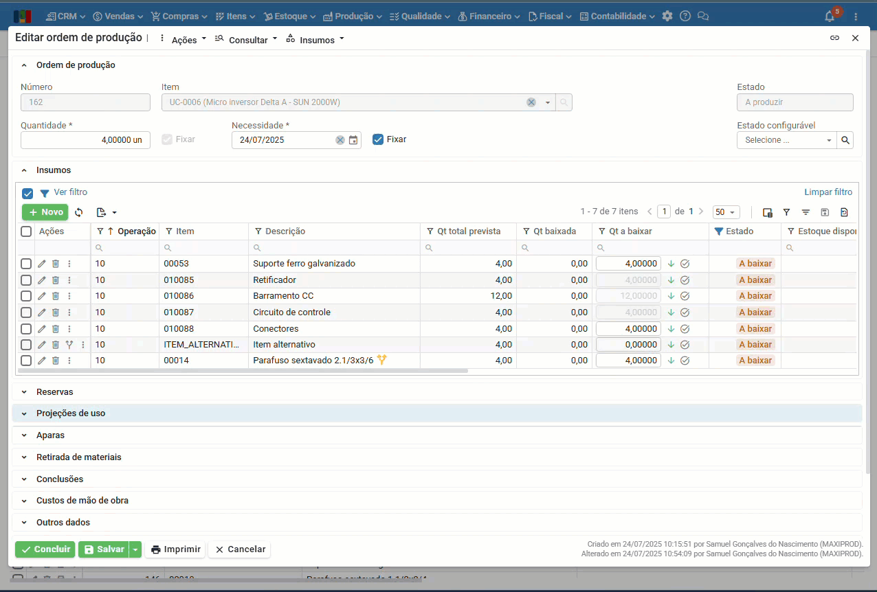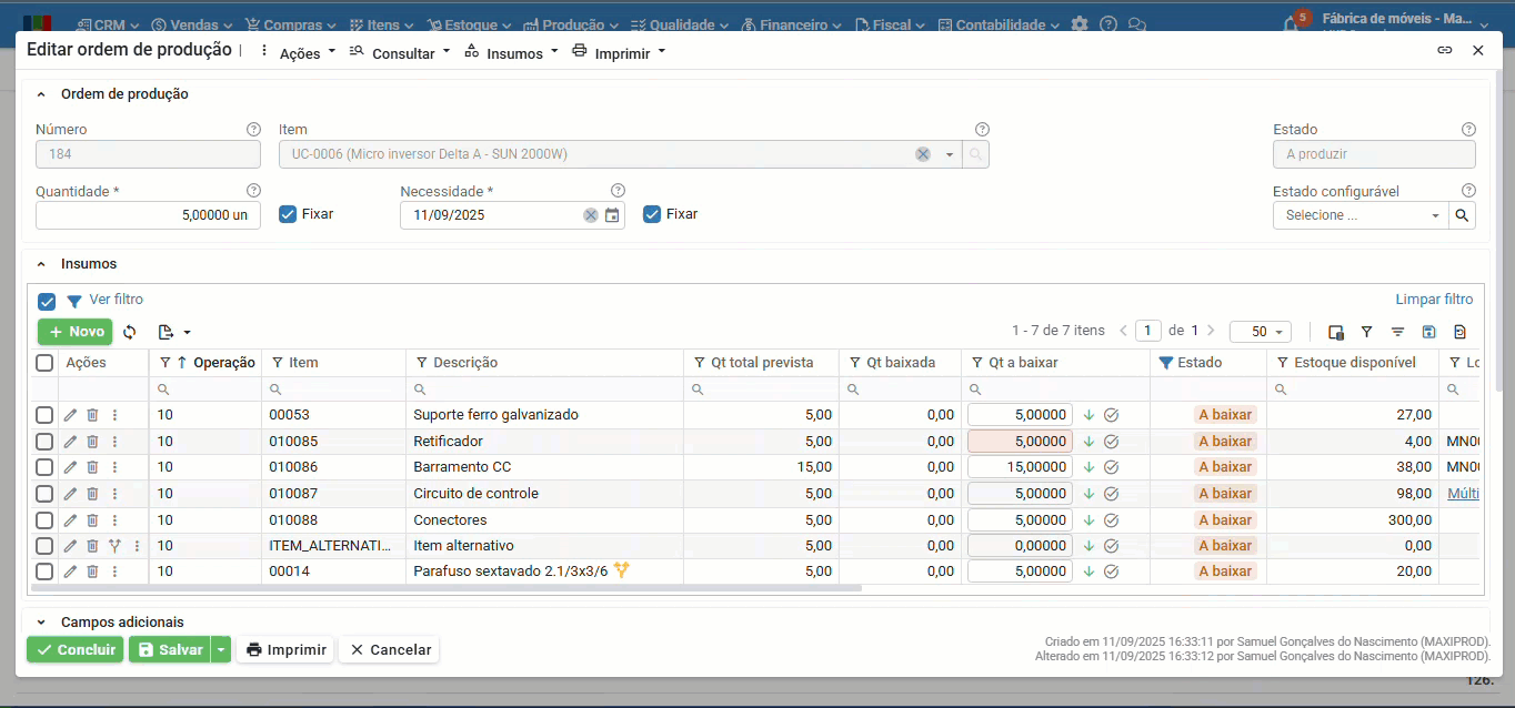 6) Alterações na estrutura do produto não atualizam automaticamente a lista de insumos da ordem de produção.