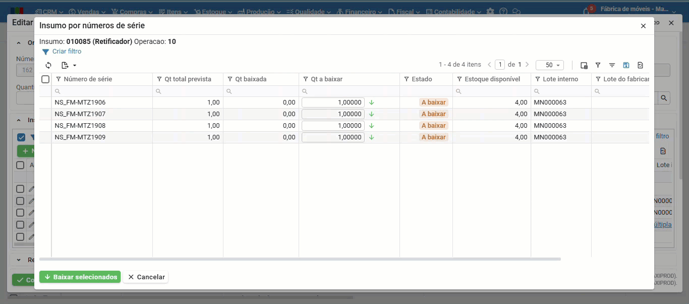 7) A baixa de insumos para número de série recebeu melhorias: quando o item produto da OP tem a forma de estocagem por número de série, os insumos com rastreabilidade (estocados por lote ou número de série) não podem ter a quantidade a baixar editada na coluna “Qt a baixar”. Ao clicar para baixar, uma nova janela é aberta listando cada número de série do produto da OP.