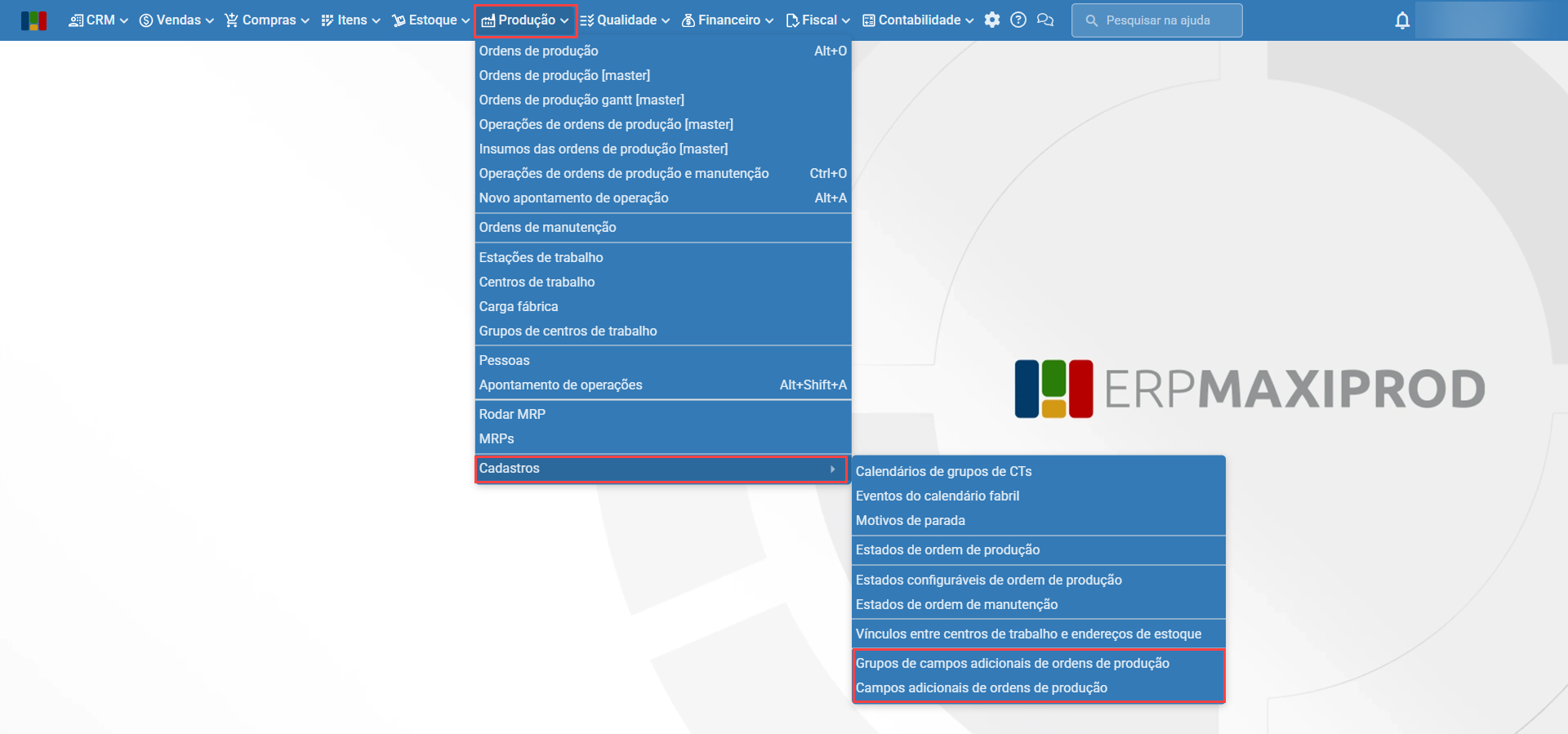 2) Outra forma: acessando a tela “Produção > Cadastros > Grupos de campos adicionais das ordens de produção” ou “Campos adicionais de ordens de produção”.