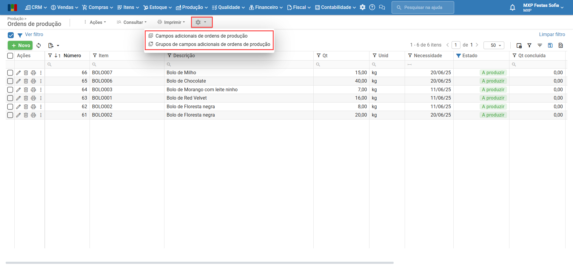 A criação de propriedades personalizadas, chamadas de “campos adicionais” é uma funcionalidade presente também em outras entidades do sistema. No caso das ordens de produção, existem somente na nova versão.