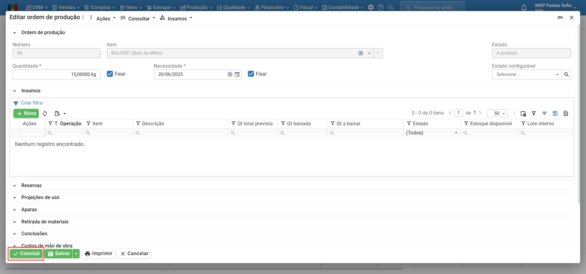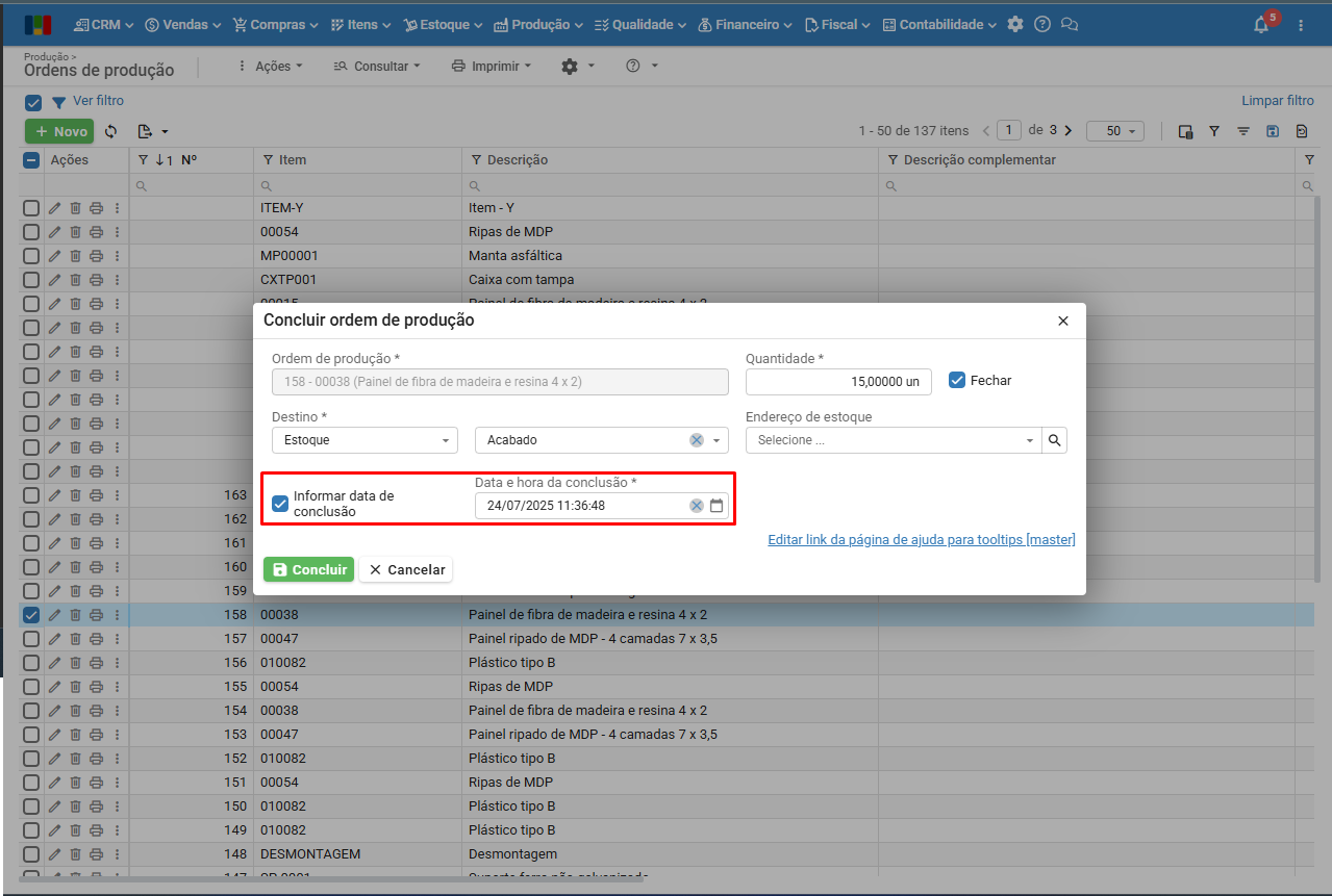 9) Ao concluir a ordem de produção, o usuário pode “Informar a data de conclusão” manualmente. Para isso, deve marcar a opção destacada na imagem abaixo e definir a data e hora da conclusão no campo à direita. Com isso a movimentação da quantidade concluída será registrada com a data e hora escolhida.