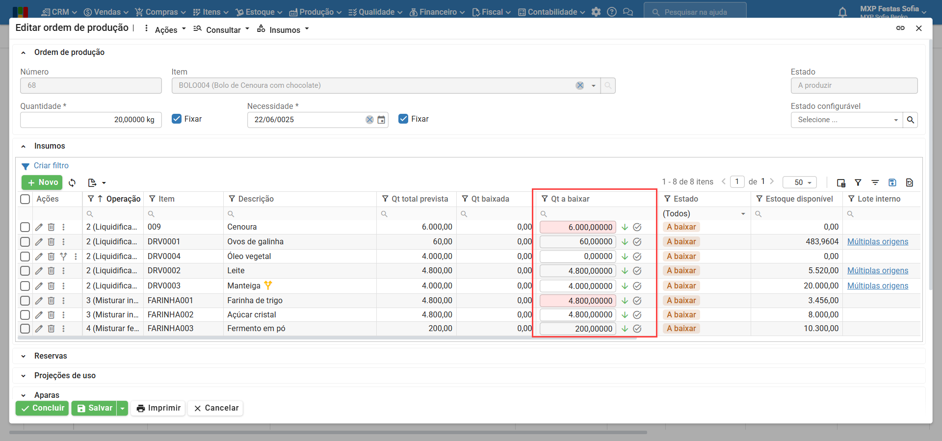 Resposta: a forma de baixar os insumos se mantém, independente de os itens terem ou não rastreabilidade. Isso inclui as verificações de disponibilidade de estoque para baixa.