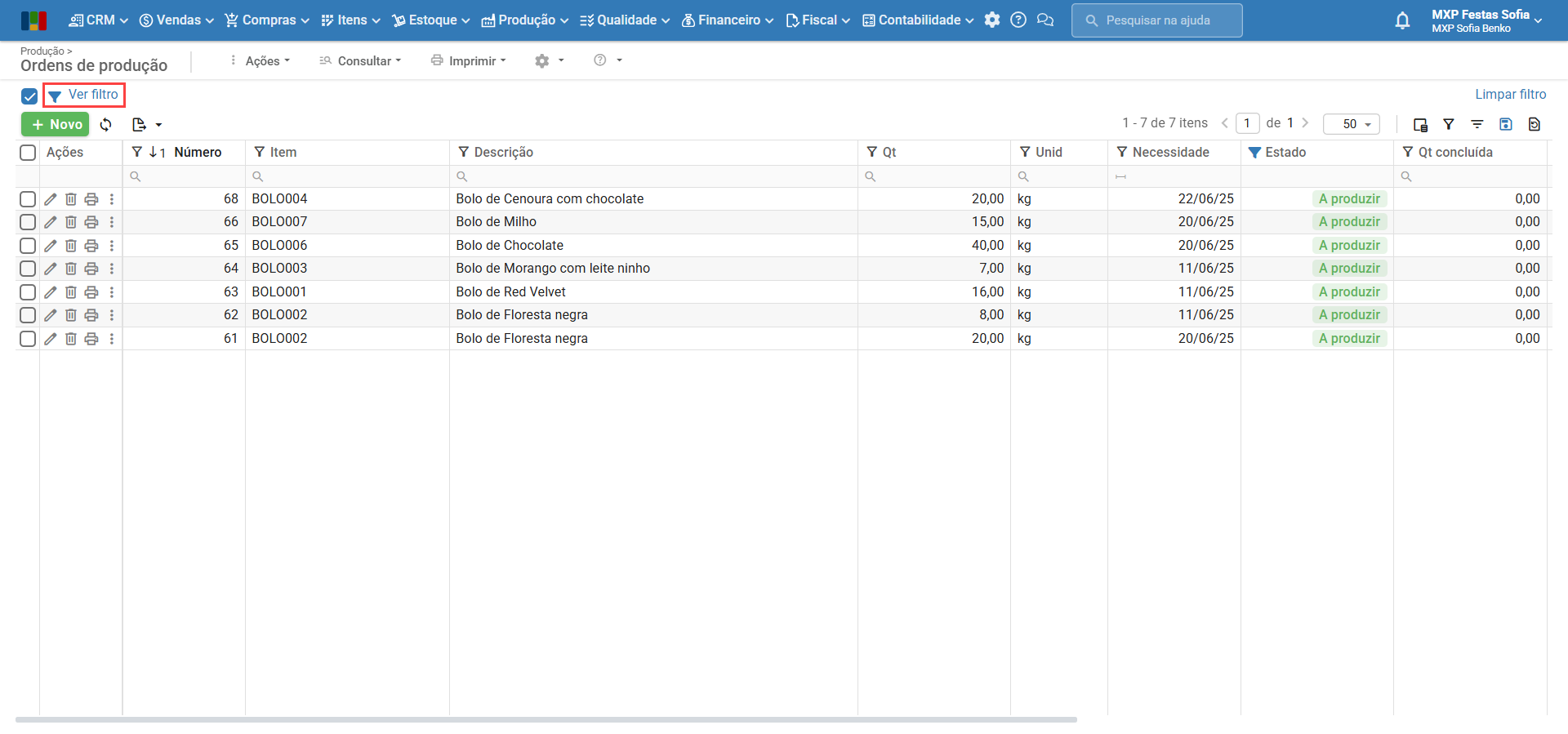 1) Acessando a tela de ordens de produção, clique em “Ver filtro”.