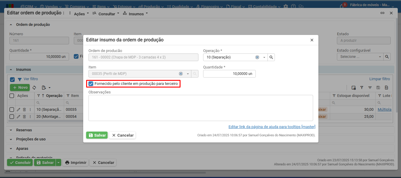 b) Insumos inicializados pela estrutura de produto podem ser editados diretamente na OP, alterando “operação”, “quantidade”, “fornecido pelo cliente em produção para terceiro”, sem alterar a estrutura do produto.