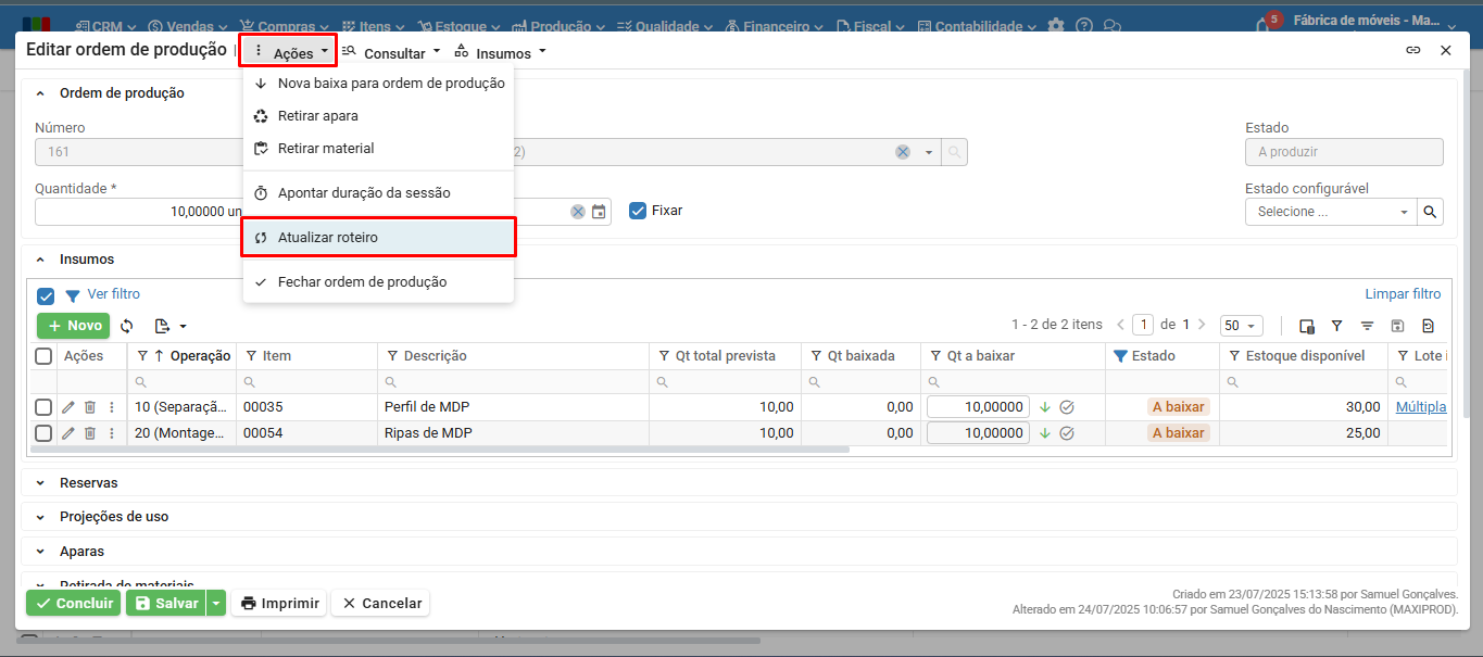 b) Se necessário, o usuário pode atualizar manualmente a OP, carregando os dados mais recentes da estrutura e do roteiro do produto.