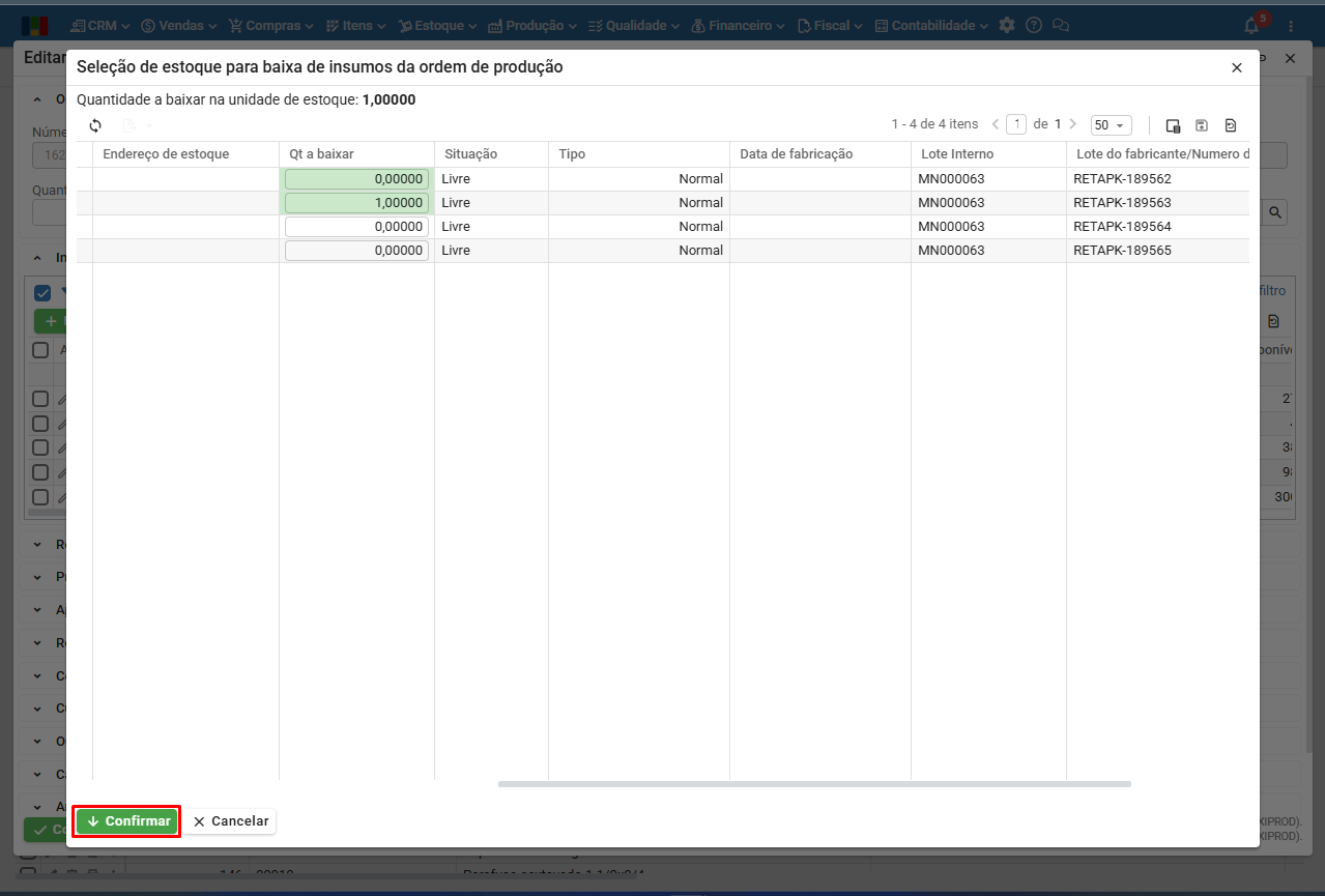 c) É nesta segunda janela que o lote ou número de série do insumo é selecionado. Ao final, o usuário deve clicar em “Confirmar” na parte inferior da janela.