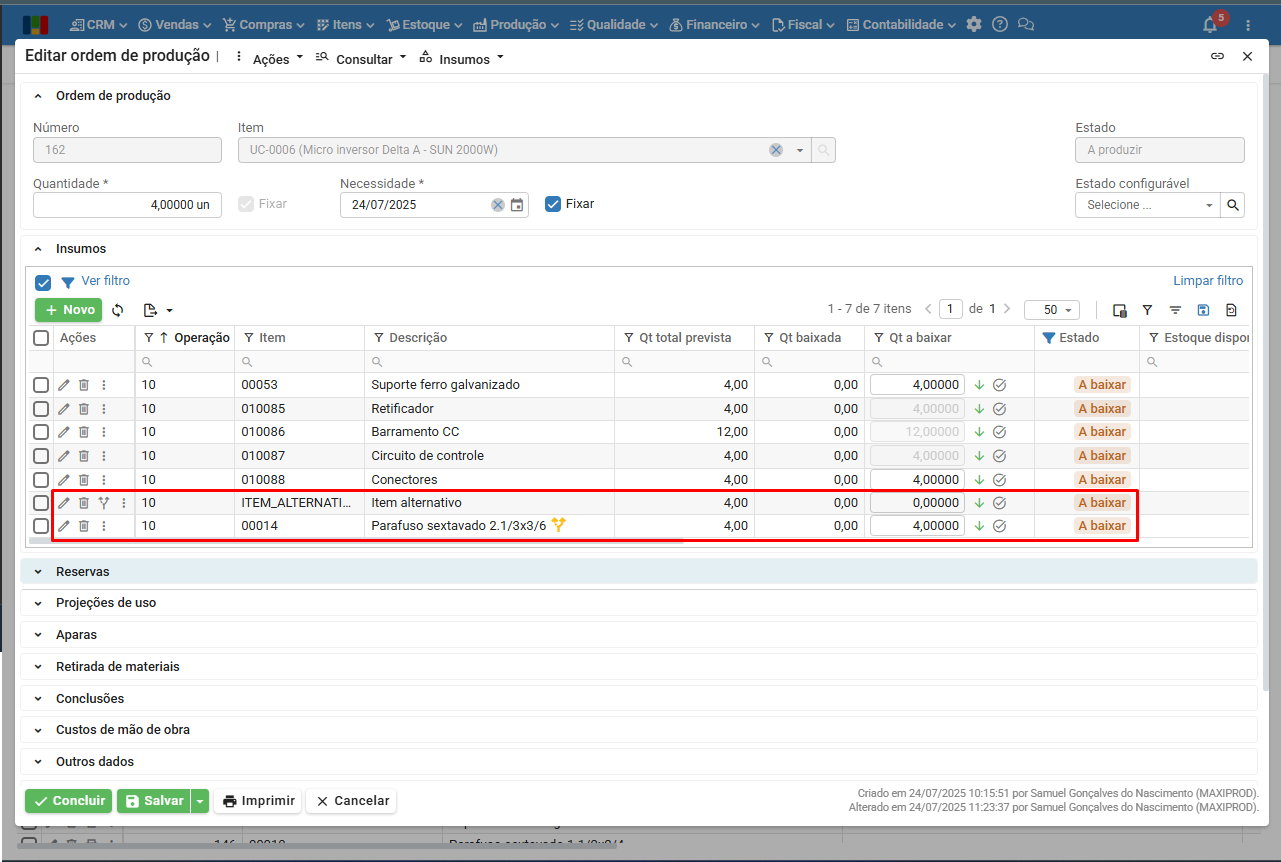 b) Ou pode optar por baixar o primeiro item-filho do item alternativo, conforme a ordem, desde que tenha estoque. Para saber mais sobre itens alternativos, clique aqui.