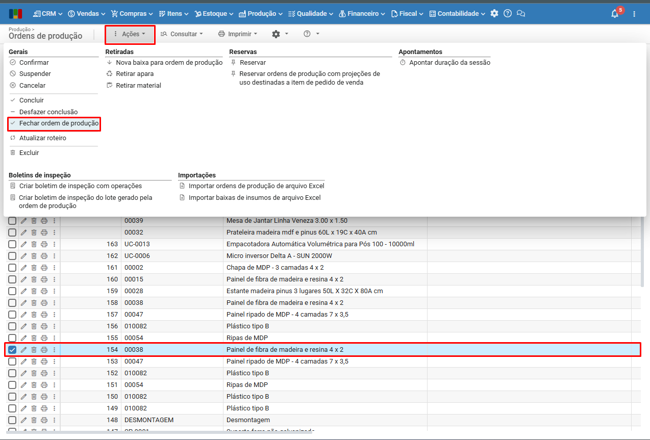 10) Agora existe a opção de “Fechar ordem de produção” que altera o estado da OP para “Fechada” (sem concluir uma nova quantidade), desde que haja uma quantidade anteriormente concluída. Para fechar a OP informando uma quantidade concluída, utilize a opção “Concluir”.