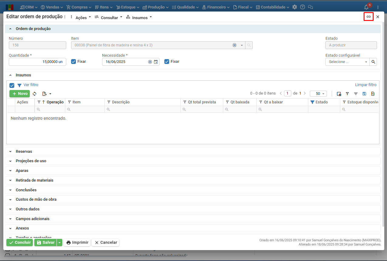 Para saber mais sobre a baixa de insumos na nova versão de OPs, clique aqui.