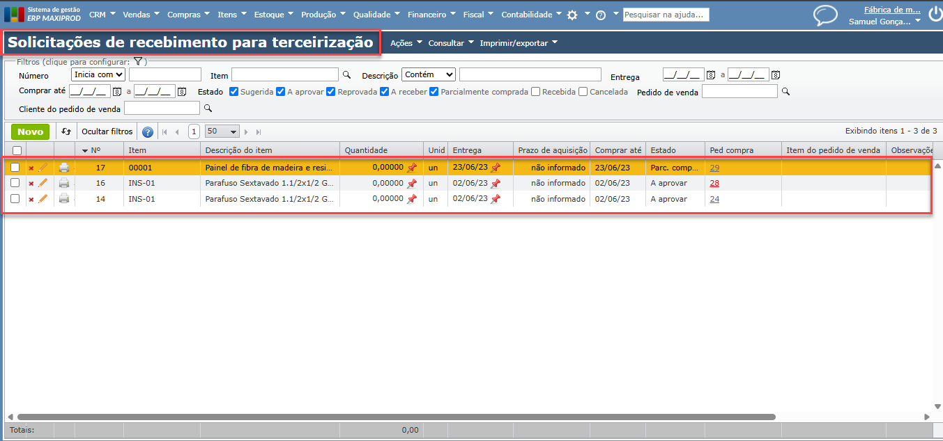 3) Quando o ERP MAXIPROD faz a gestão da terceirização da empresa cliente, gera “Solicitações de Envio para Terceirização (SETs)”, listando os insumos de nossa propriedade que devem ser enviados para o fornecedor do produto. Para acessar a tela de SETs vá ao menu superior “Compras > Solicitações de envio para terceirização”.