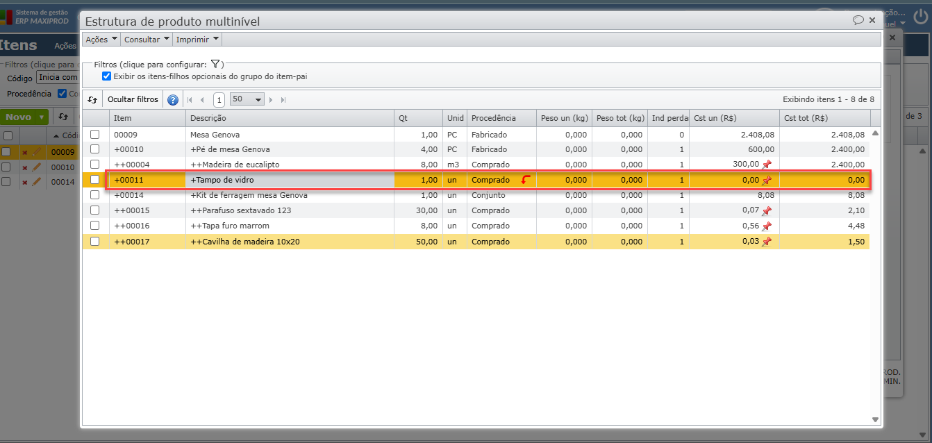 a) Neste exemplo, o tampo de vidro será fornecido pelo cliente, os demais itens serão produzidos/comprados pela minha empresa.