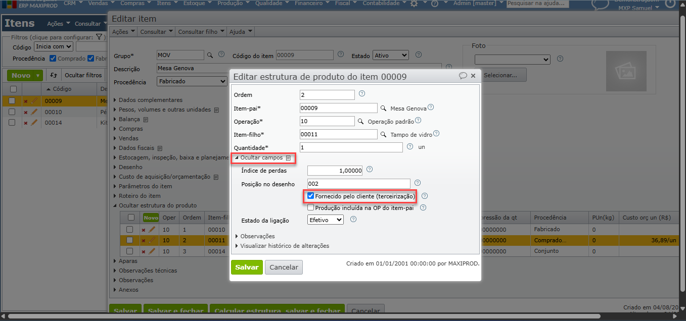 b) Para indicar que o tampo de vidro é fornecido pelo cliente, devemos marcar a opção “Fornecido pelo cliente (terceirização)” no cadastro da estrutura de produto, conforme figura abaixo.