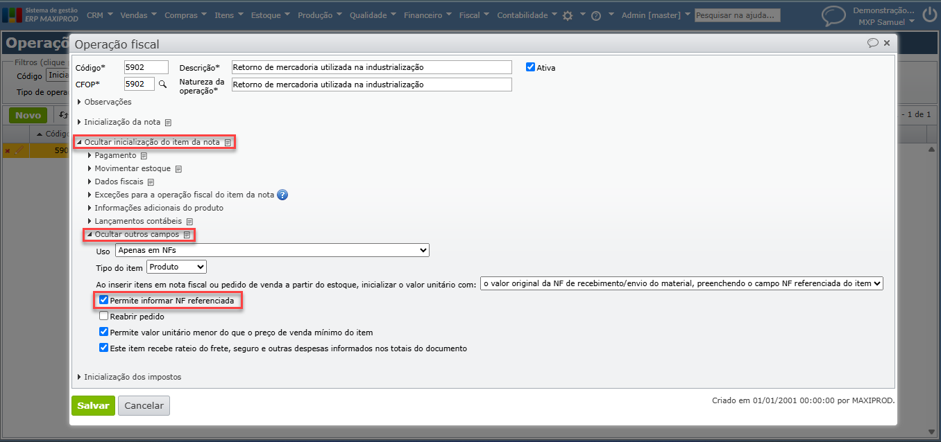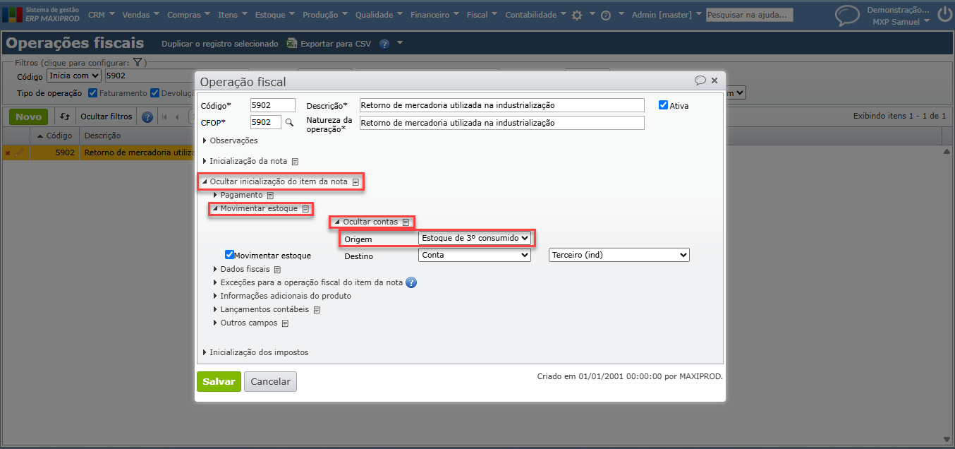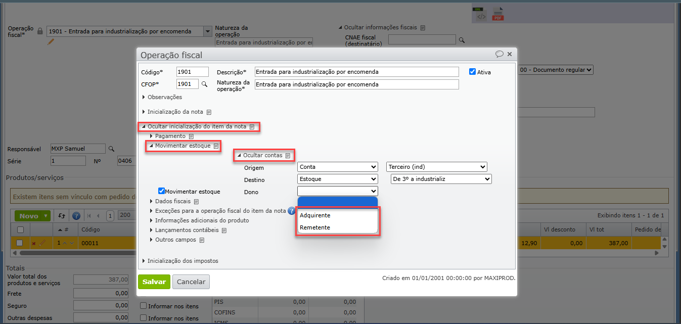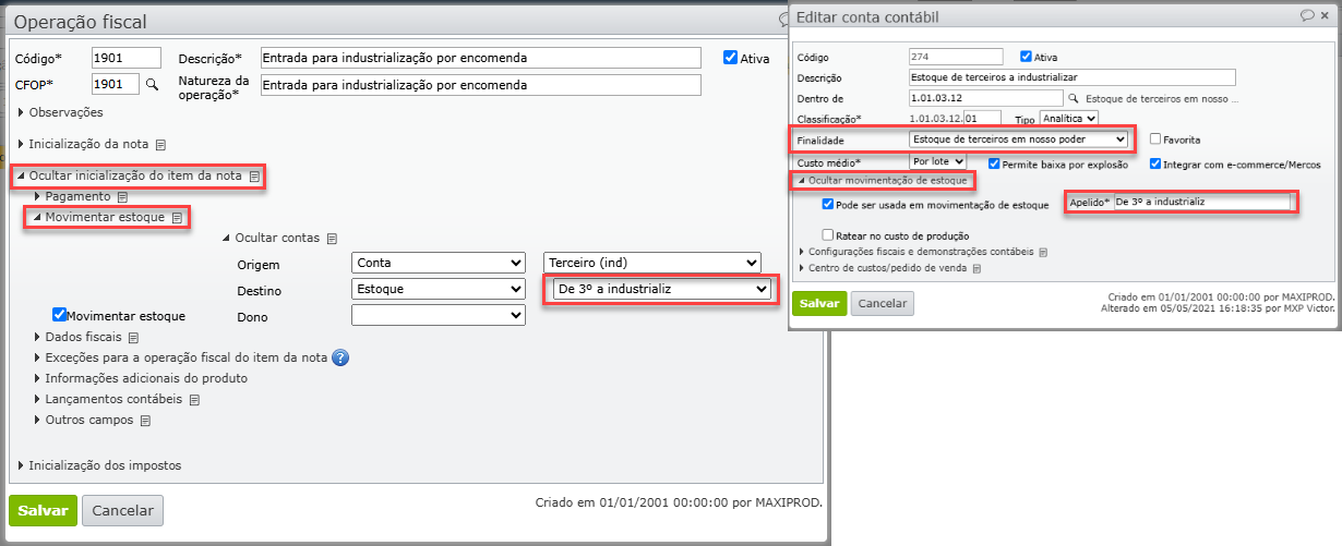 2) O material enviado pelo cliente será colocado no estoque por meio do recebimento de uma nota fiscal cuja operação fiscal inicializa a conta de destino da finalidade “Estoque de terceiros em nosso poder” chamada no plano padrão do ERP MAXIPROD de “De 3º a industrializar”. Para saber mais sobre contas contábeis e suas propriedades, clique aqui.