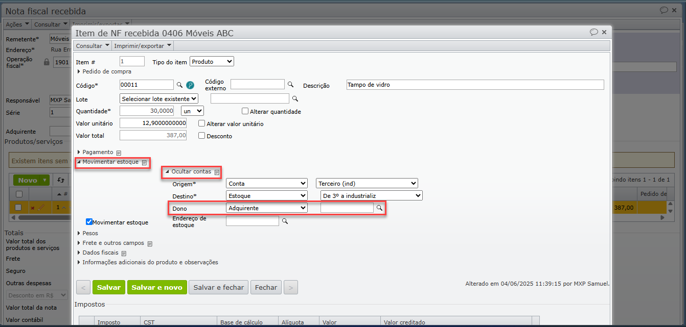 b) Se “Remetente” será movimentado para estoque em que o dono é a empresa remetente desta nota fiscal. Se “Adquirente”, será movimentado para estoque em que o dono é a empresa indicada no campo à direita (a opção “Adquirente” é utilizada quando há triangulação no processo de terceirização, ou seja, o remetente da nota não é o cliente da terceirização).