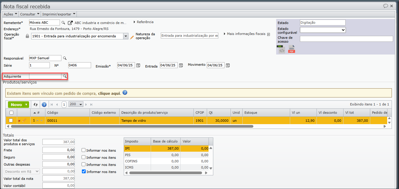 c) Ou pode ser informado um único adquirente por nota, preenchendo o campo destacado na imagem abaixo (para que este campo apareça, o dono na operação fiscal deve estar configurado como “Adquirente”).