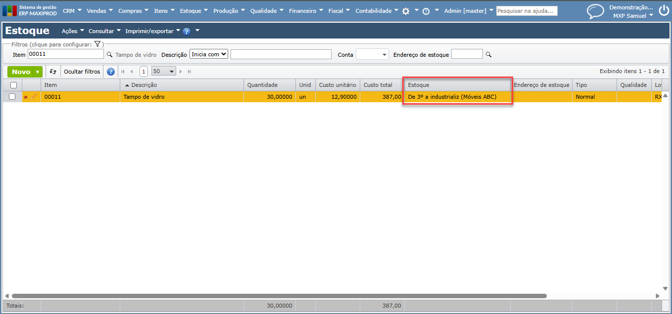 3) No sistema, o item fornecido pelo cliente é estocado em uma conta “De 3º a industrializ”, que distingue o estoque de terceiros do estoque da própria empresa.