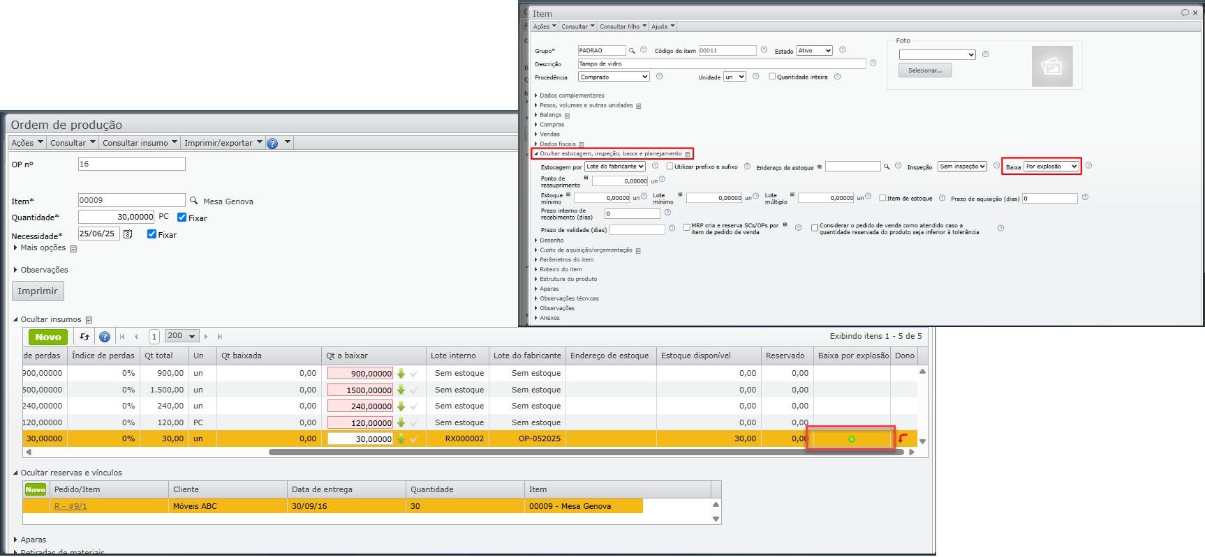 4) Ao concluir a OP, se a opção “Baixa por explosão” estiver configurada no cadastro do insumo fornecido pelo cliente, e a conta de estoque na qual o insumo se encontra permitir baixa por explosão, este será baixado automaticamente. Para saber mais, clique aqui.