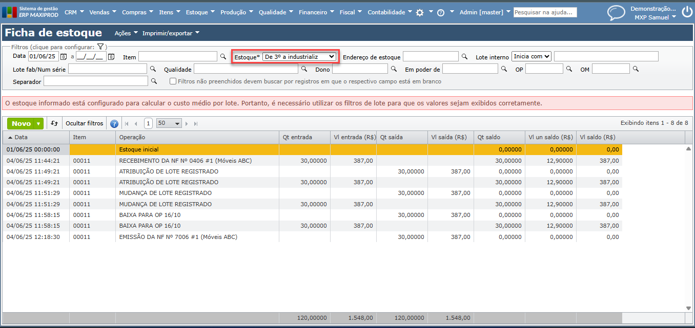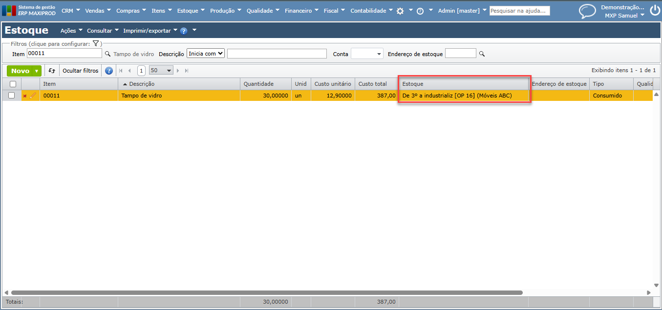 5) Após ser baixado, o estoque de 3º passa do tipo “normal” para “consumido” e exibe o número da ordem de produção para a qual foi baixado.
