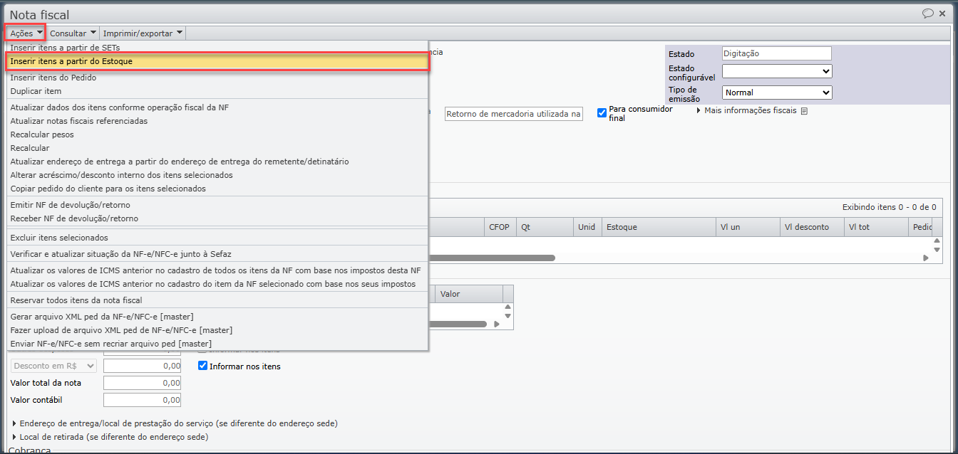 7) Para inserir os itens na nota fiscal de retorno, após informar cliente e operação fiscal, vá ao menu “Ações > Inserir itens a partir do estoque”.