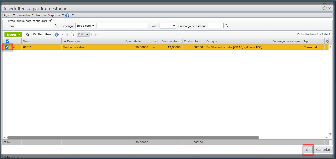 a) Na janela que será exibida, selecione os registros de estoque consumidos (marcando as respectivas caixa de seleção) e em seguida clique no botão “Ok” no canto inferior direito da tela.