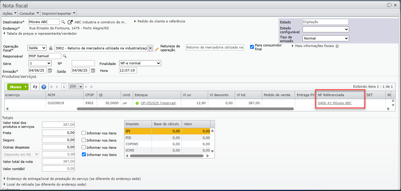 - o sistema registra isso automaticamente, ou seja, quando um material de propriedade de terceiro é baixado como insumo para uma ordem de produção, ele é acrescentado a uma lista de estoques consumidos, que informa tanto a origem (a nota fiscal de recebimento do material) como o destino (a ordem de produção). Isto também facilita a montagem da nota fiscal de “retorno dos materiais de terceiros utilizados na industrialização”.