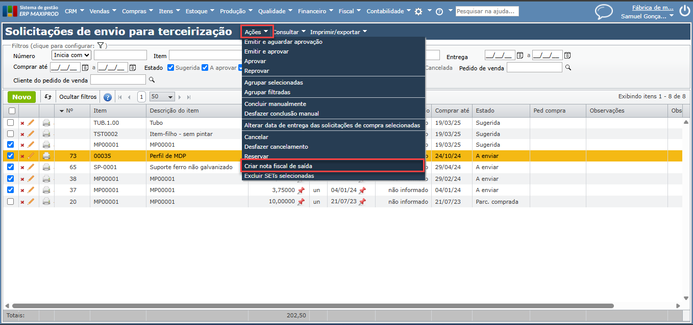 3) Na tela “Solicitações de envio para terceirização”, é possível filtrar várias SETs no estado “A enviar” e em seguida acessar “Ações > Criar nota fiscal de saída”.