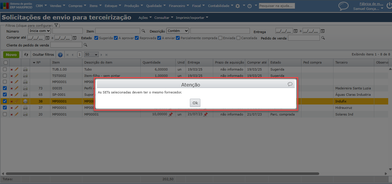 a) Se as “SETs” selecionadas tiverem o campo “Terceiro” preenchido, o sistema verifica se o terceiro é o mesmo para todas elas. Caso não seja, retorna a seguinte mensagem: “As SETs selecionadas devem ter o mesmo fornecedor.”.