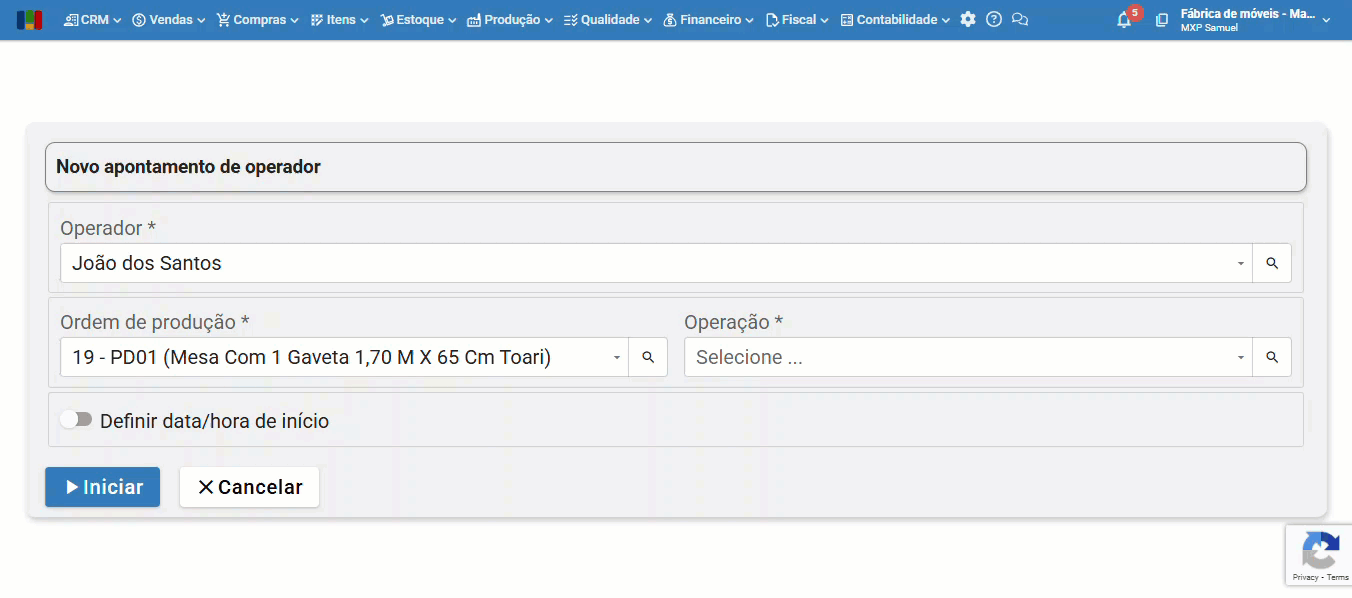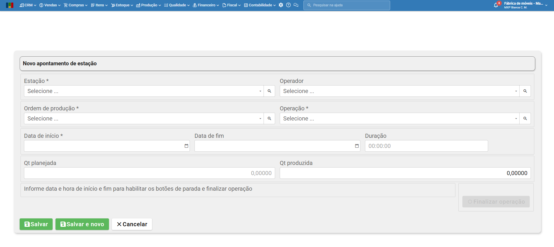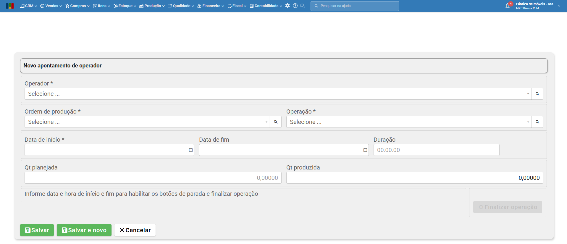• Finalizar operação: se for marcado, o campo “Data de fim” se torna obrigatório, e a operação da ordem de produção será finalizada.