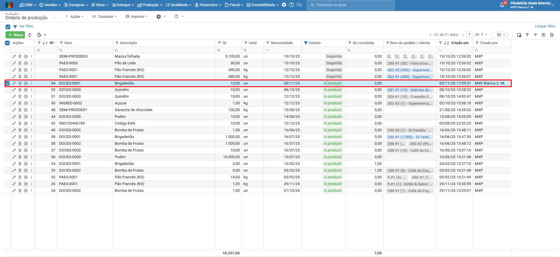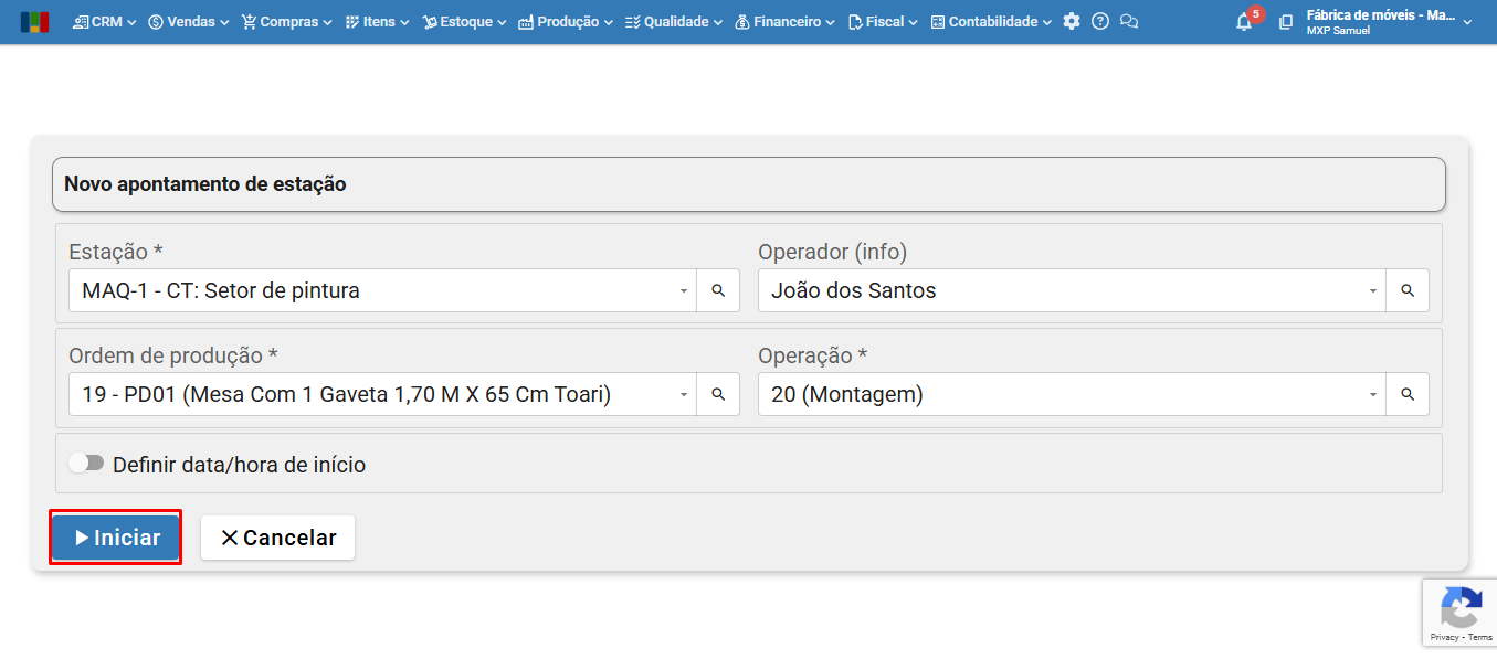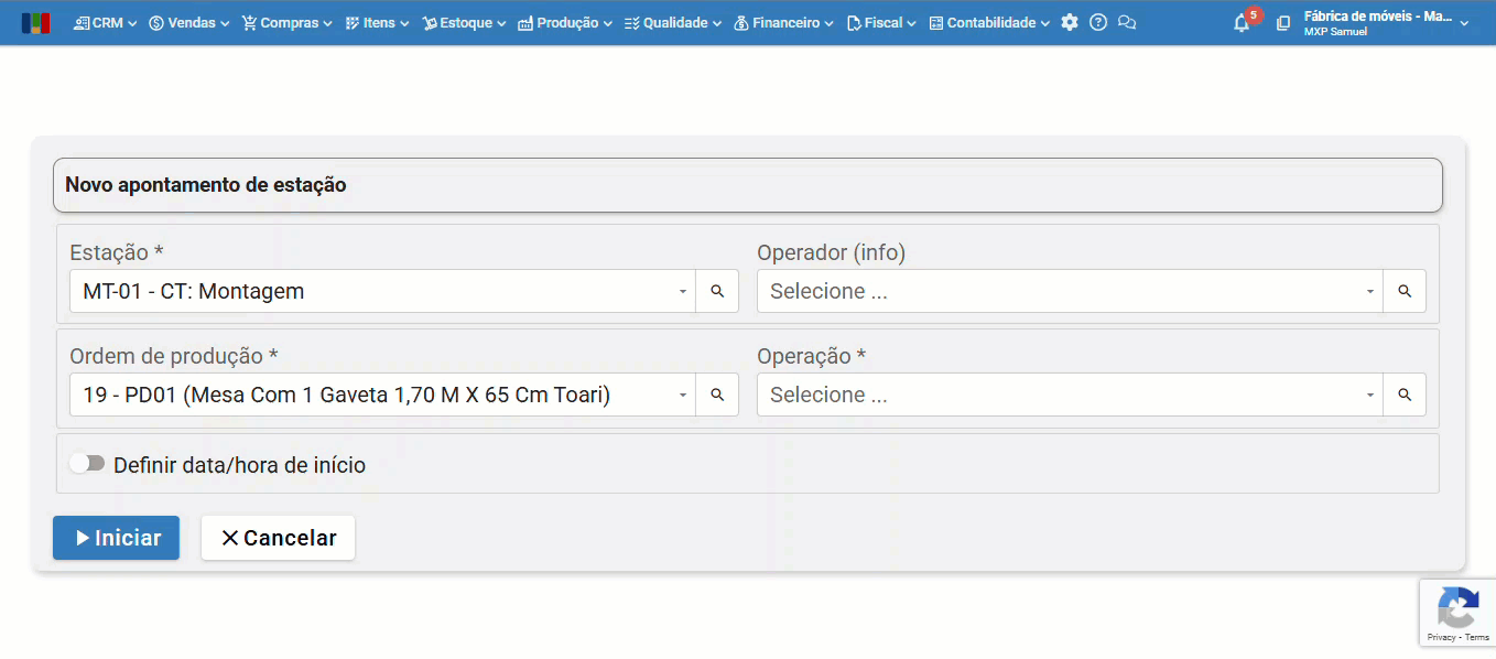 • Estação: permite selecionar uma opção na lista das estações de trabalho cadastradas em “Produção > Estações de trabalho”. Para saber mais, clique aqui.