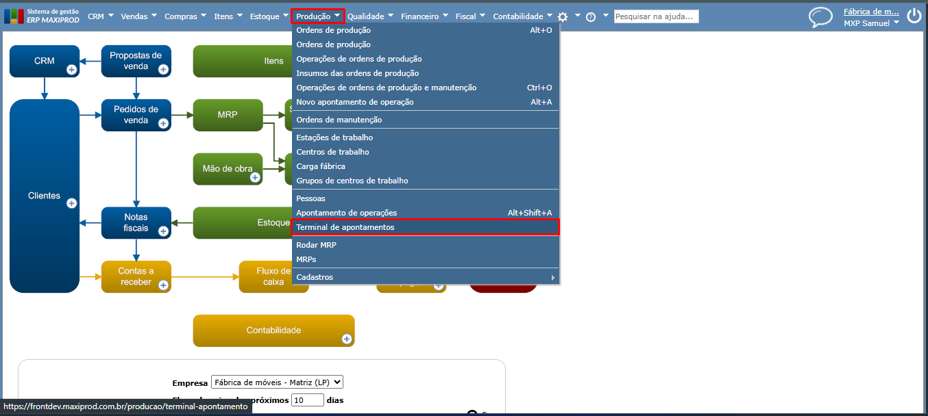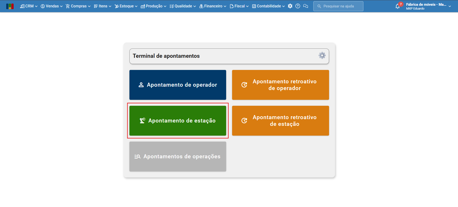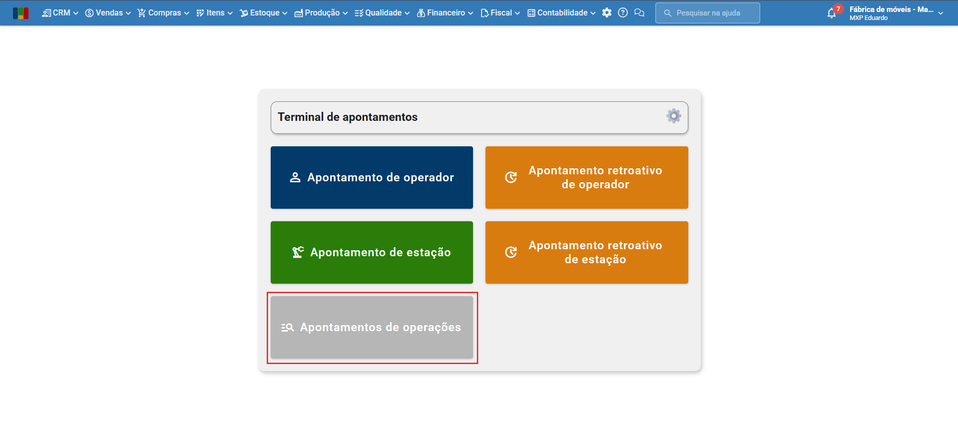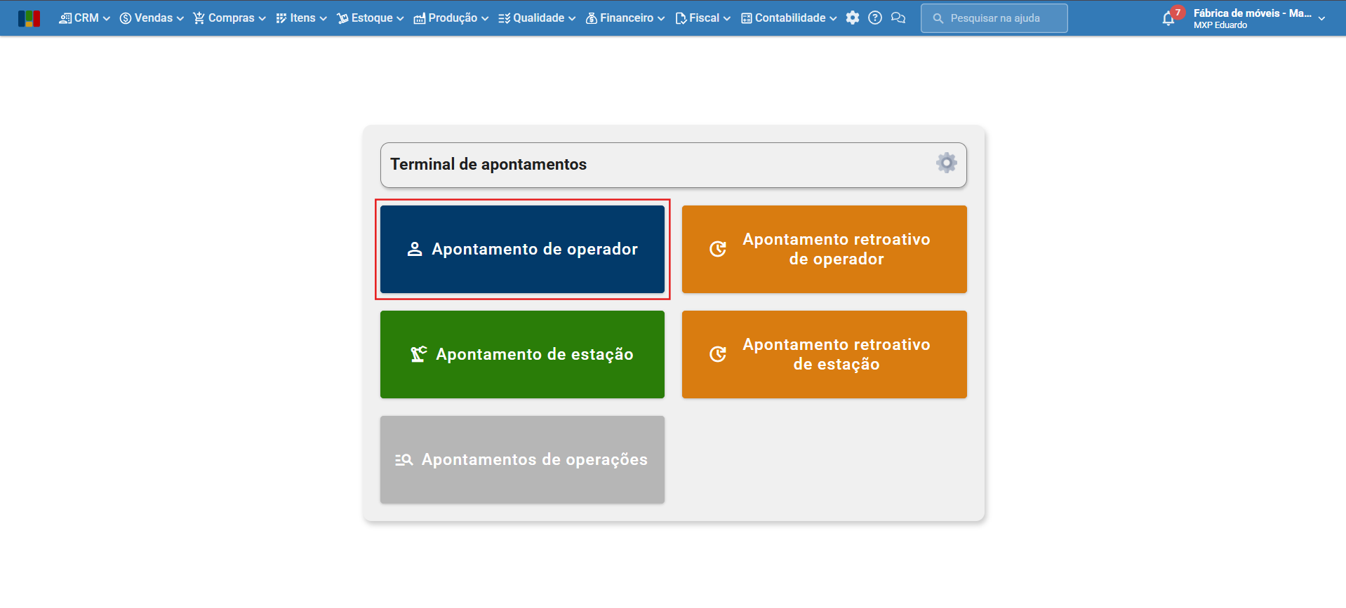 1) Acesse o menu superior “Produção > Terminal de apontamentos”.