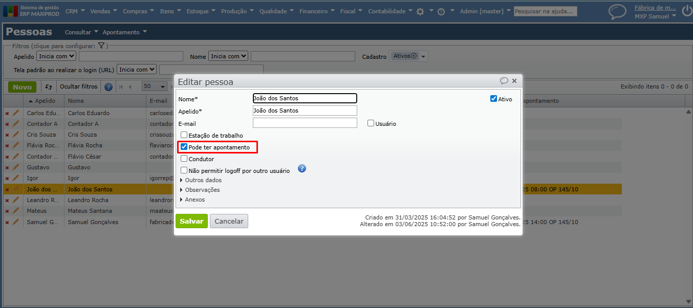 • Operador (info): campo não obrigatório. Lista as opções cadastradas em “Produção > Pessoas” que tenha a configuração “Pode ter apontamento” marcada. Para saber mais, acesse por meio do menu superior “Produção > Pessoas”.