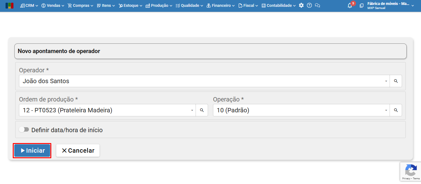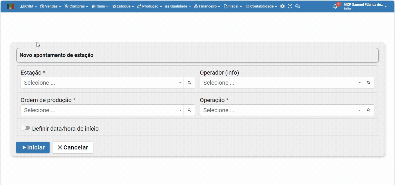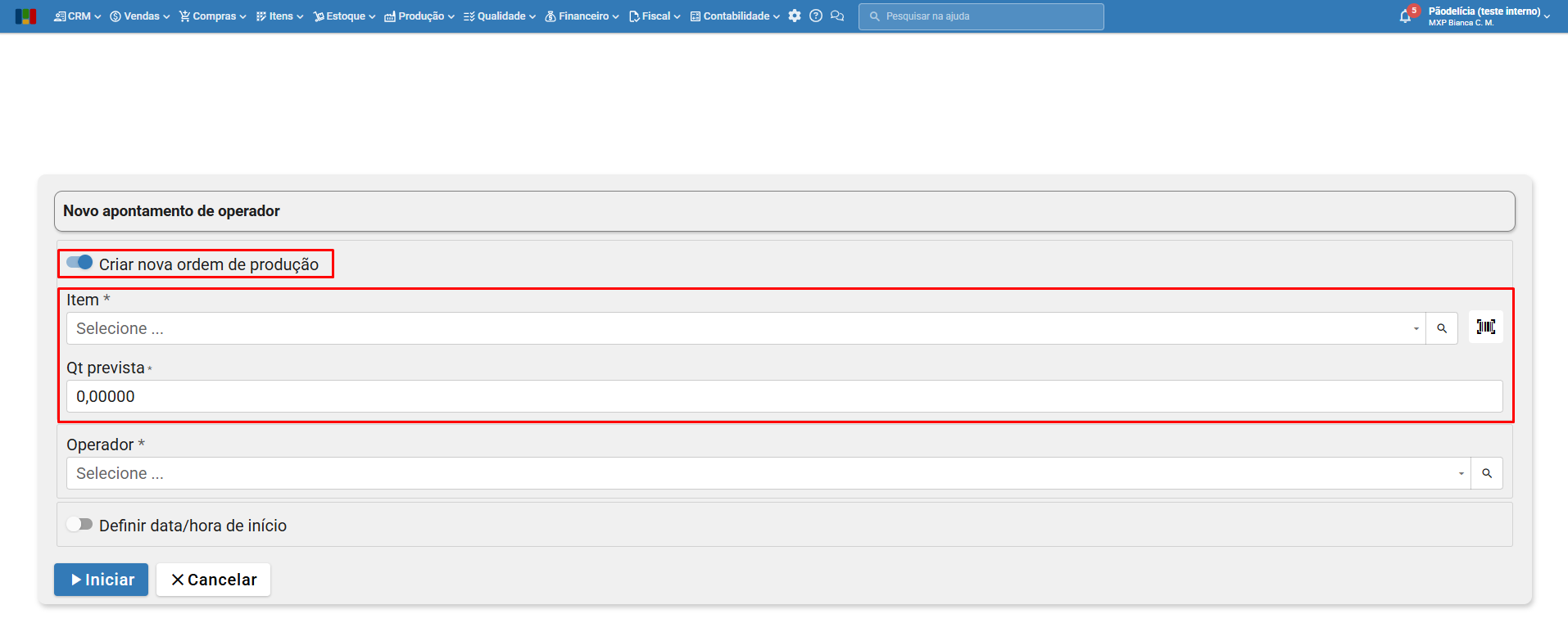 3) Ao selecionar esta opção, é aberta a tela “Novo apontamento de operador”, que permite selecionar/ preencher os campos informados abaixo. Clique no botão azul “Iniciar” para criar o apontamento.