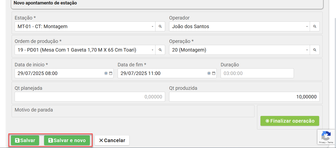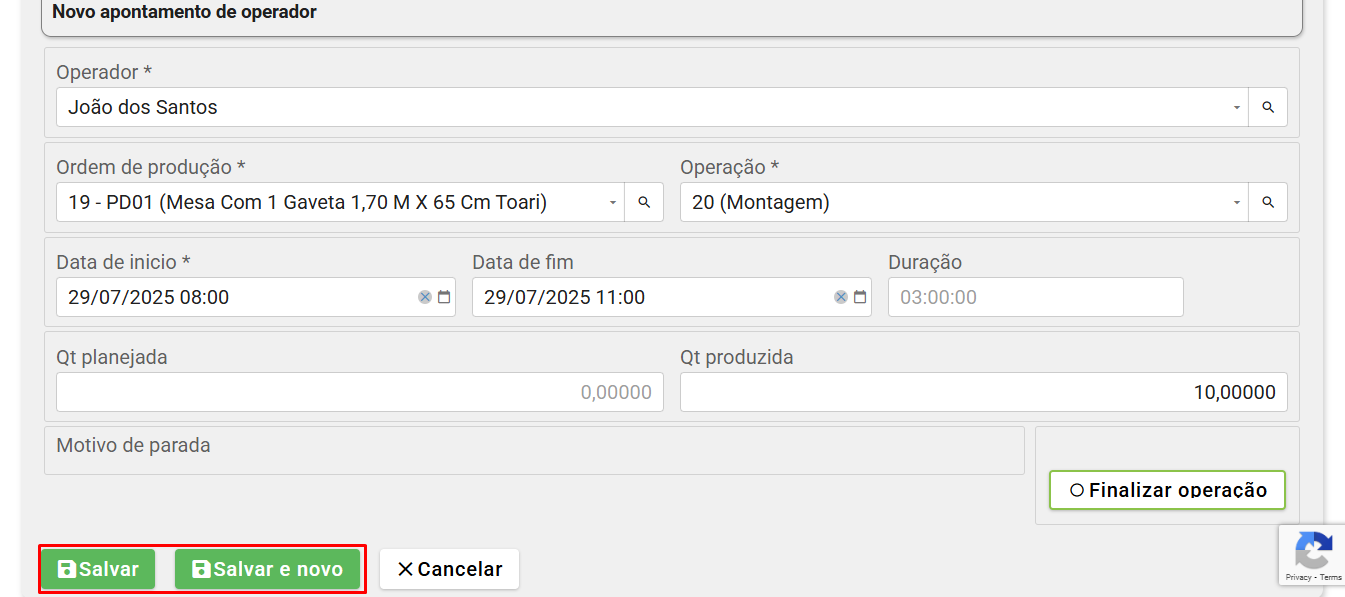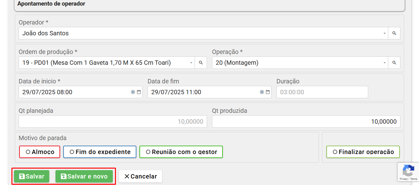 4) Para criar o apontamento retroativo de operador, clique no botão verde “Salvar” ou “Salvar e novo”.