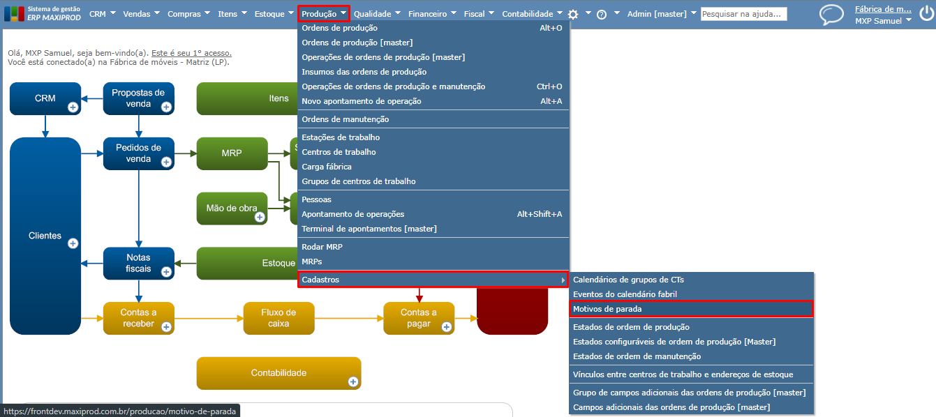1) Acesse o menu superior “Produção > Cadastros > Motivos de parada”.