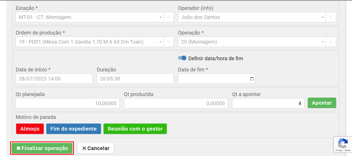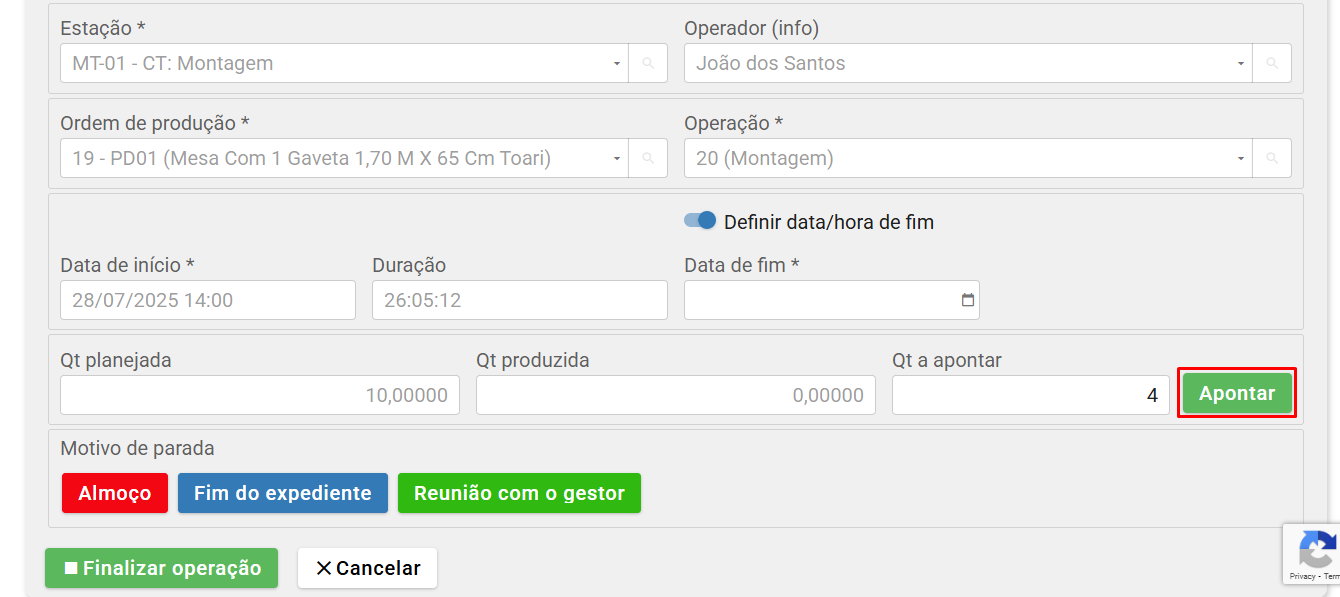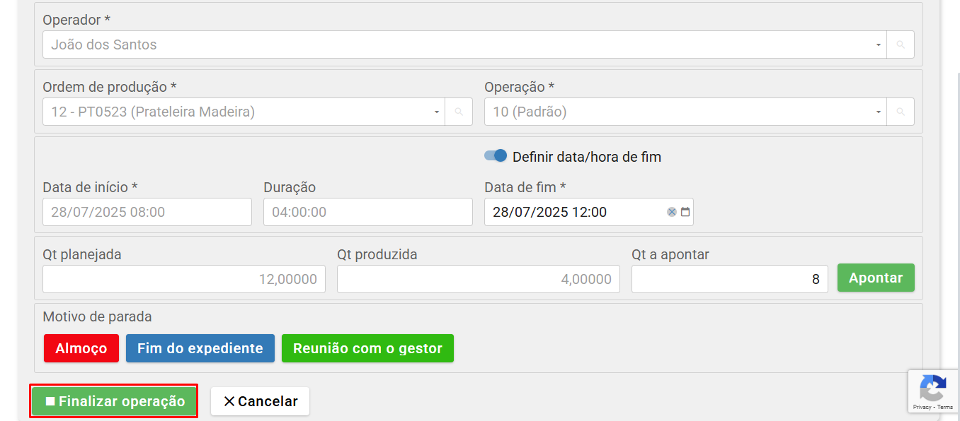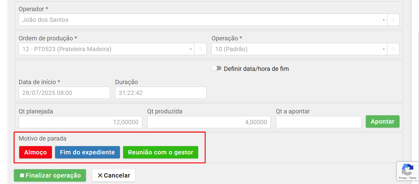 Observação: só é possível salvar um apontamento retroativo com data de fim se um motivo de parada ou a finalização da operação estiver selecionada.