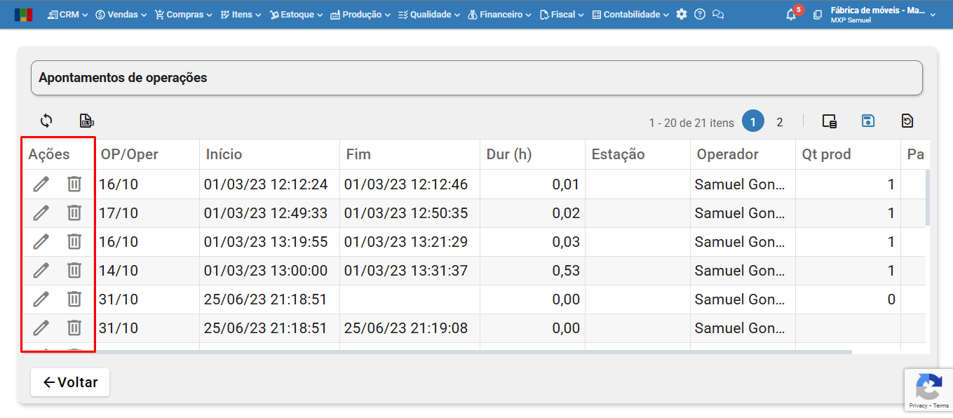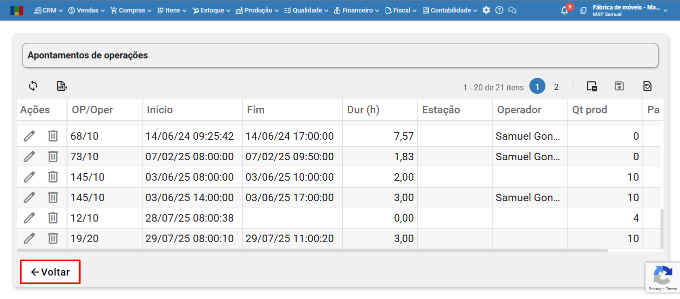 • Qt produzida: campo editável, permite informar a quantidade produzida do apontamento.