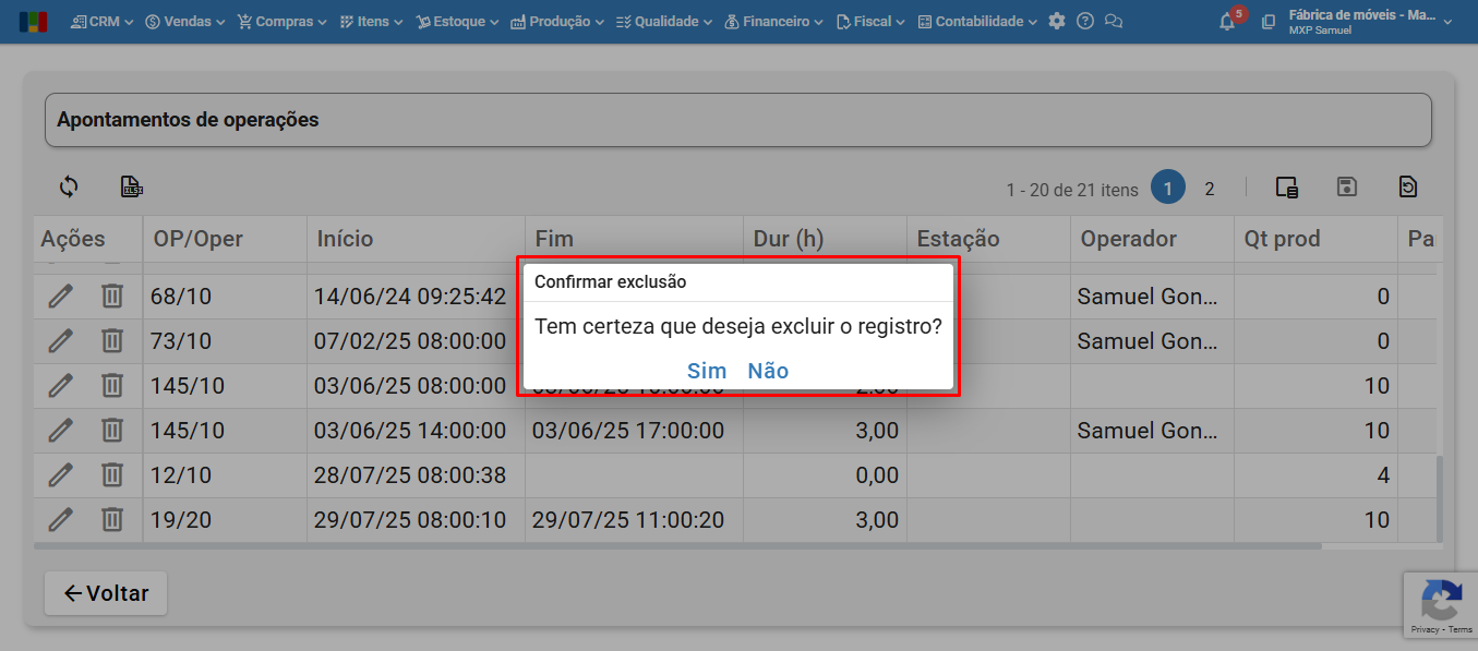 b) Ao clicar para excluir o apontamento, o sistema exibe uma mensagem de confirmação “Tem certeza que deseja excluir o registro?”. Clique em “Sim” para confirmar e exclusão ou clique em “Não” para abortar a exclusão.