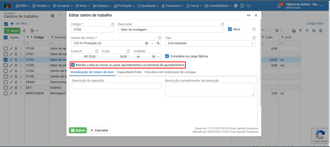 c) Na janela de edição dos centros de trabalho, marque ou desmarque a caixa de seleção da opção “Manter a tela ao iniciar ou parar apontamentos via terminal de apontamentos”.