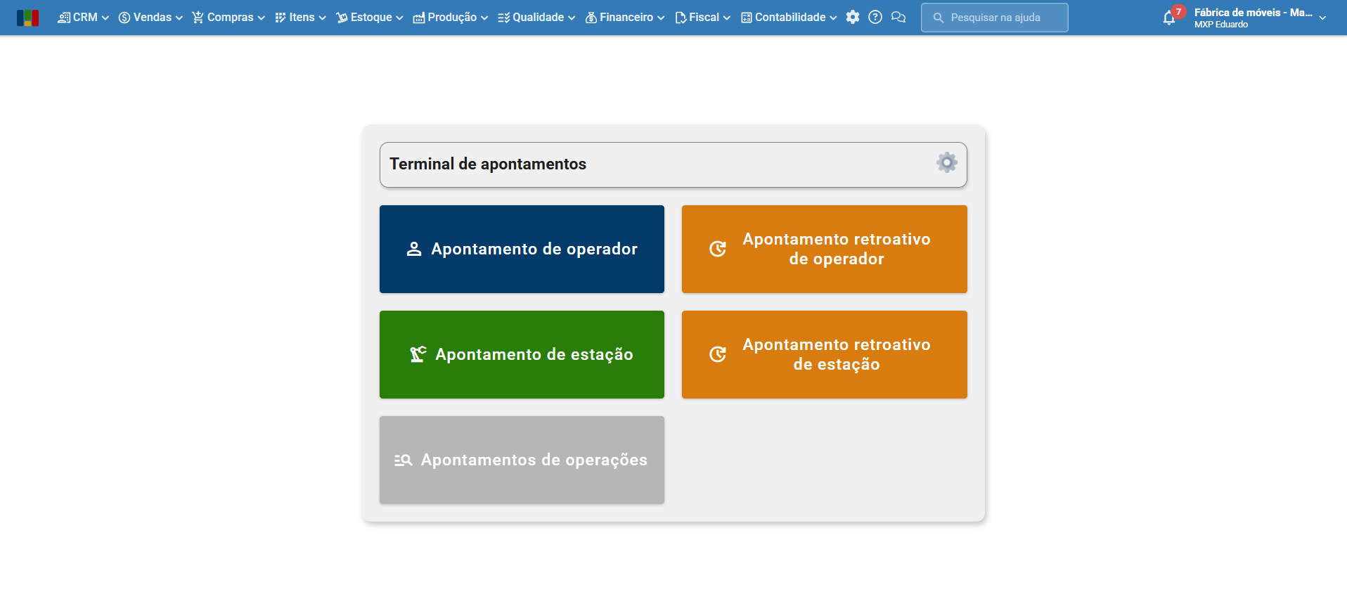 O terminal de apontamentos é uma tela simplificada, voltada para o registro rápido da produção no chão de fábrica. Permite que os operadores informem, de forma prática, o andamento das ordens de produção, como início, pausa, retomada e conclusão das operações.