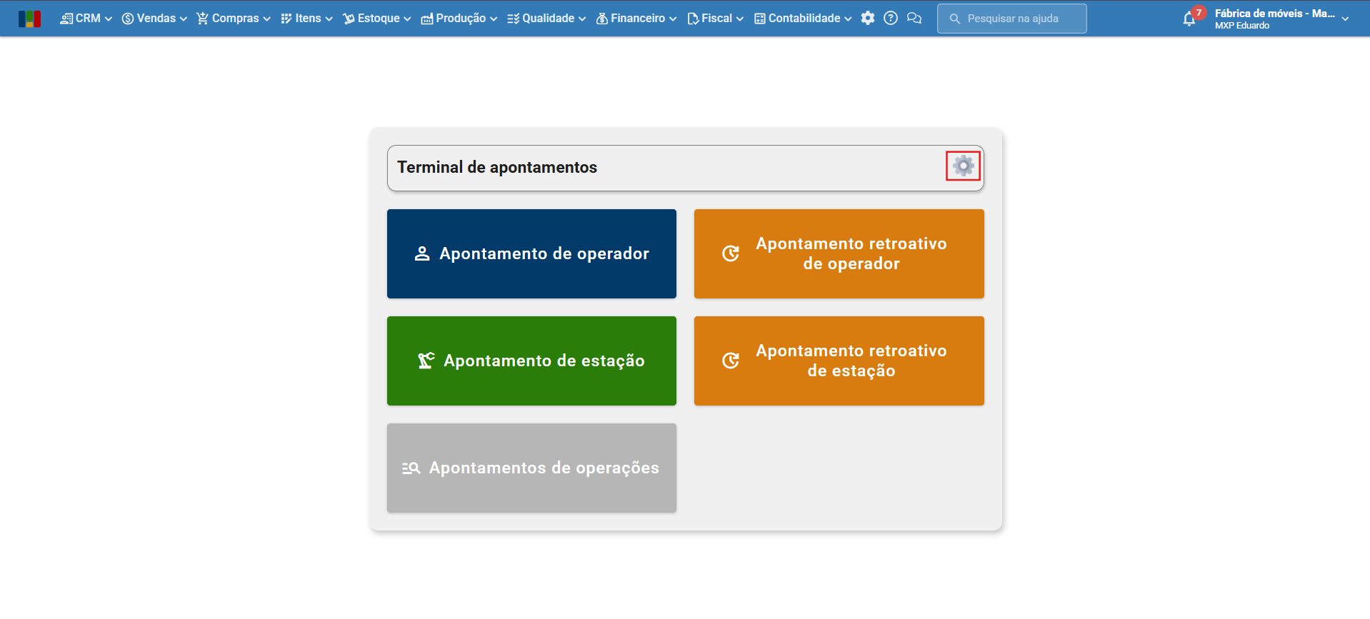 1) Na tela do terminal de apontamentos, clique no ícone da “roda dentada” na parte superior direita da janela.