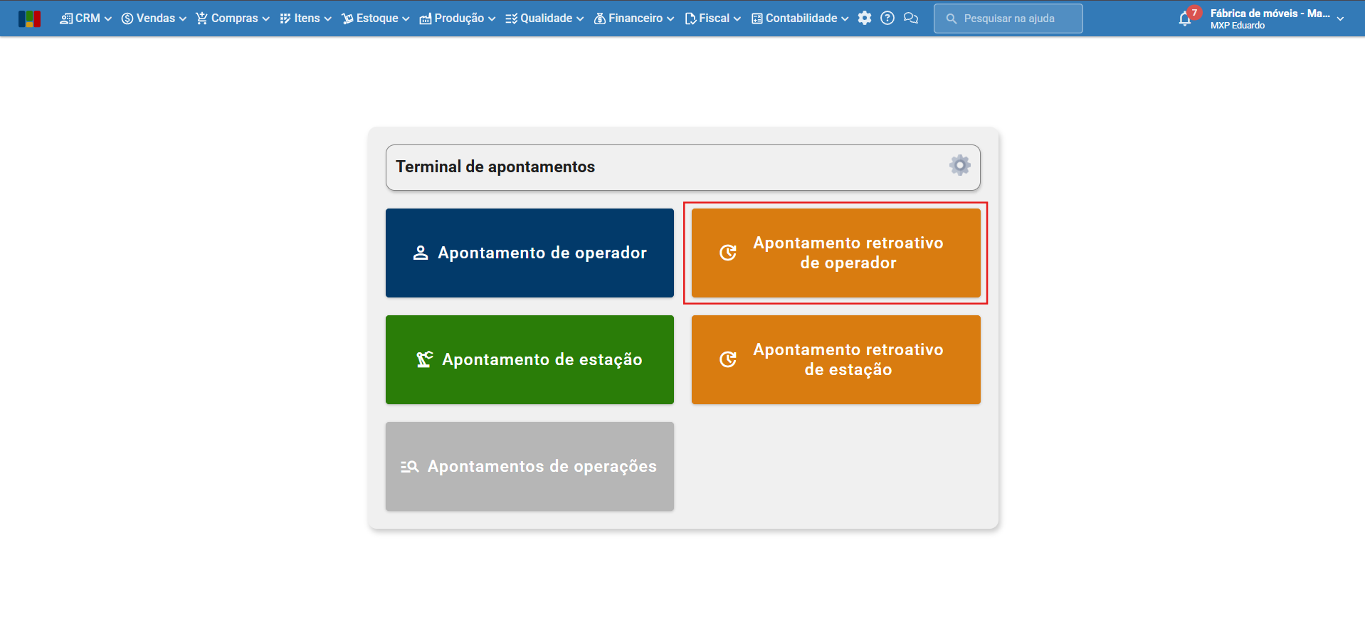2) Na tela do terminal de apontamentos, clique na opção “Apontamento retroativo de operador”.