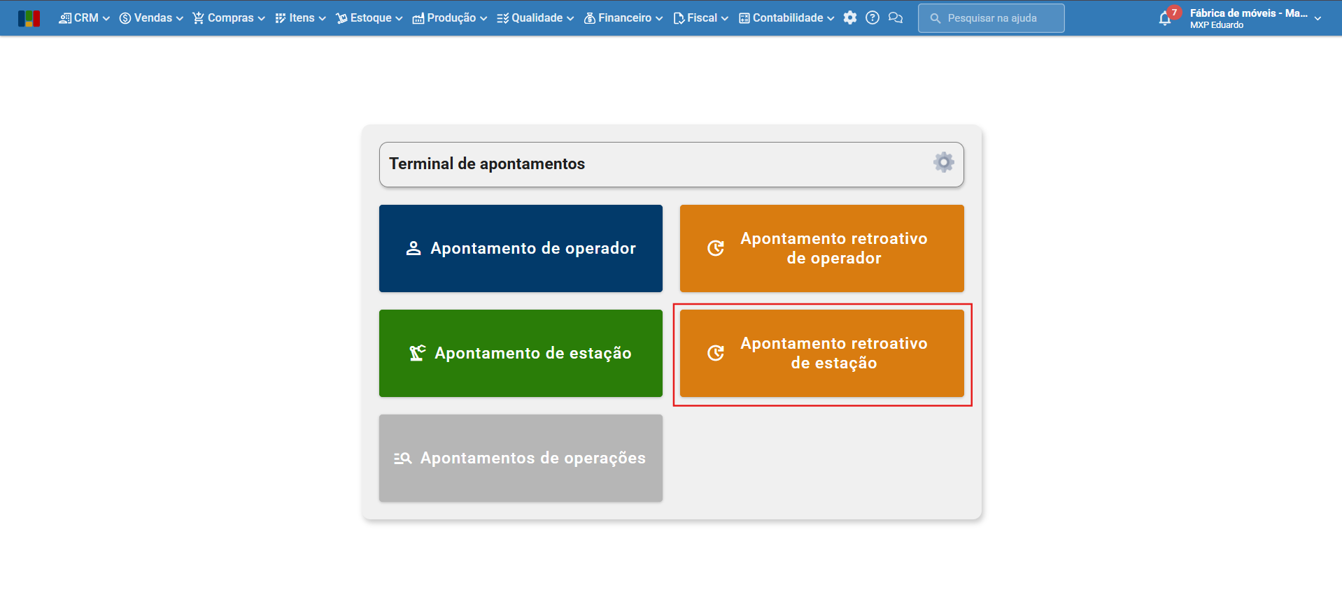 • Estação: permite selecionar uma opção na lista das estações de trabalho cadastradas em “Produção > Estações de trabalho”.